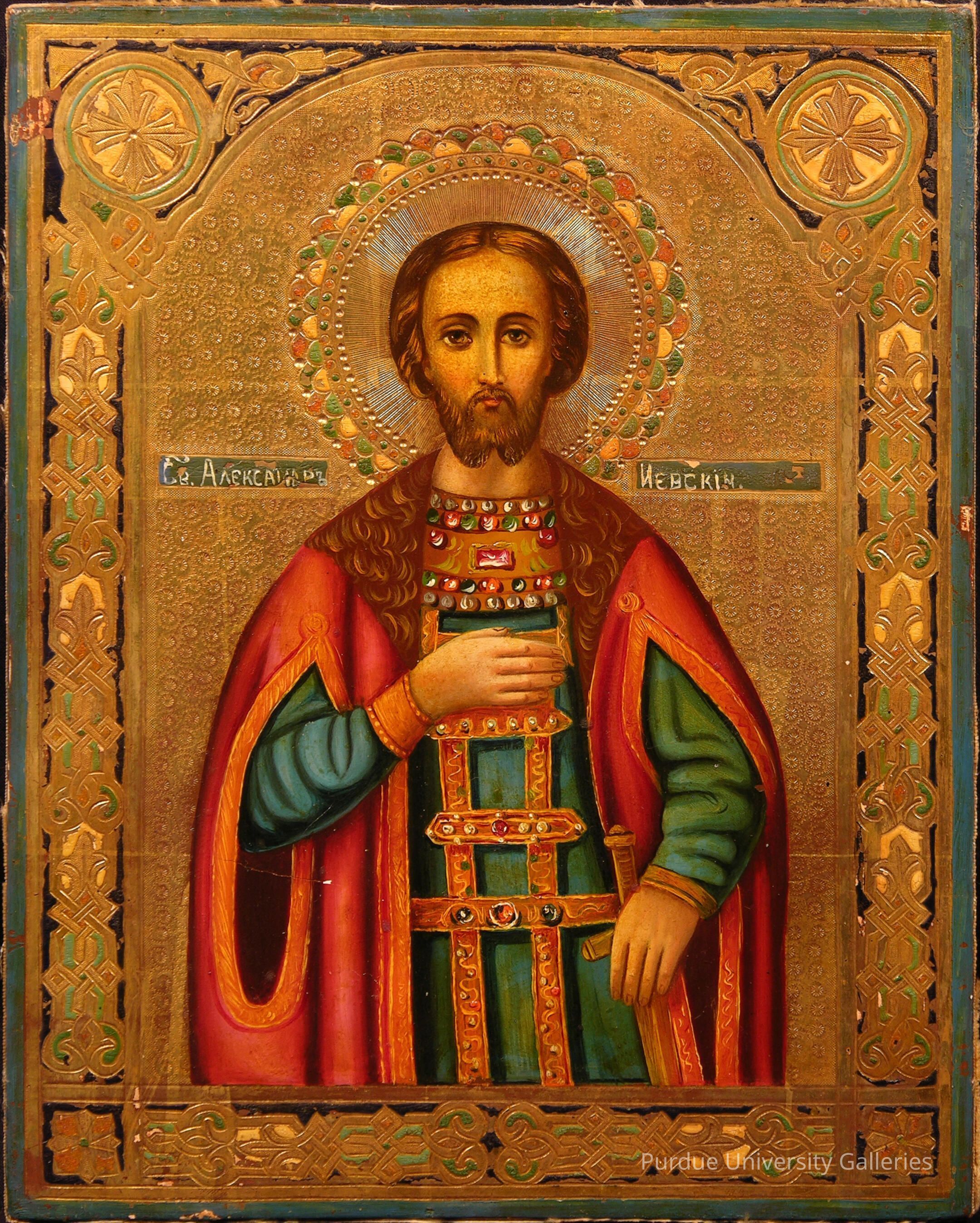 This fine portrait of St. Alexander Nevsky displays the 13th-century military leader’s warrior trappings and honors him for his defense of Russia against the Swedes, Teutonic Knights, and Lithuanians. The softened facial features and lavish accoutrements, rendered with three-dimensional shading, attest to an influence from the West in the realistic attention to detail. Rich colors and an abundant use of gold enhance the overall effect.