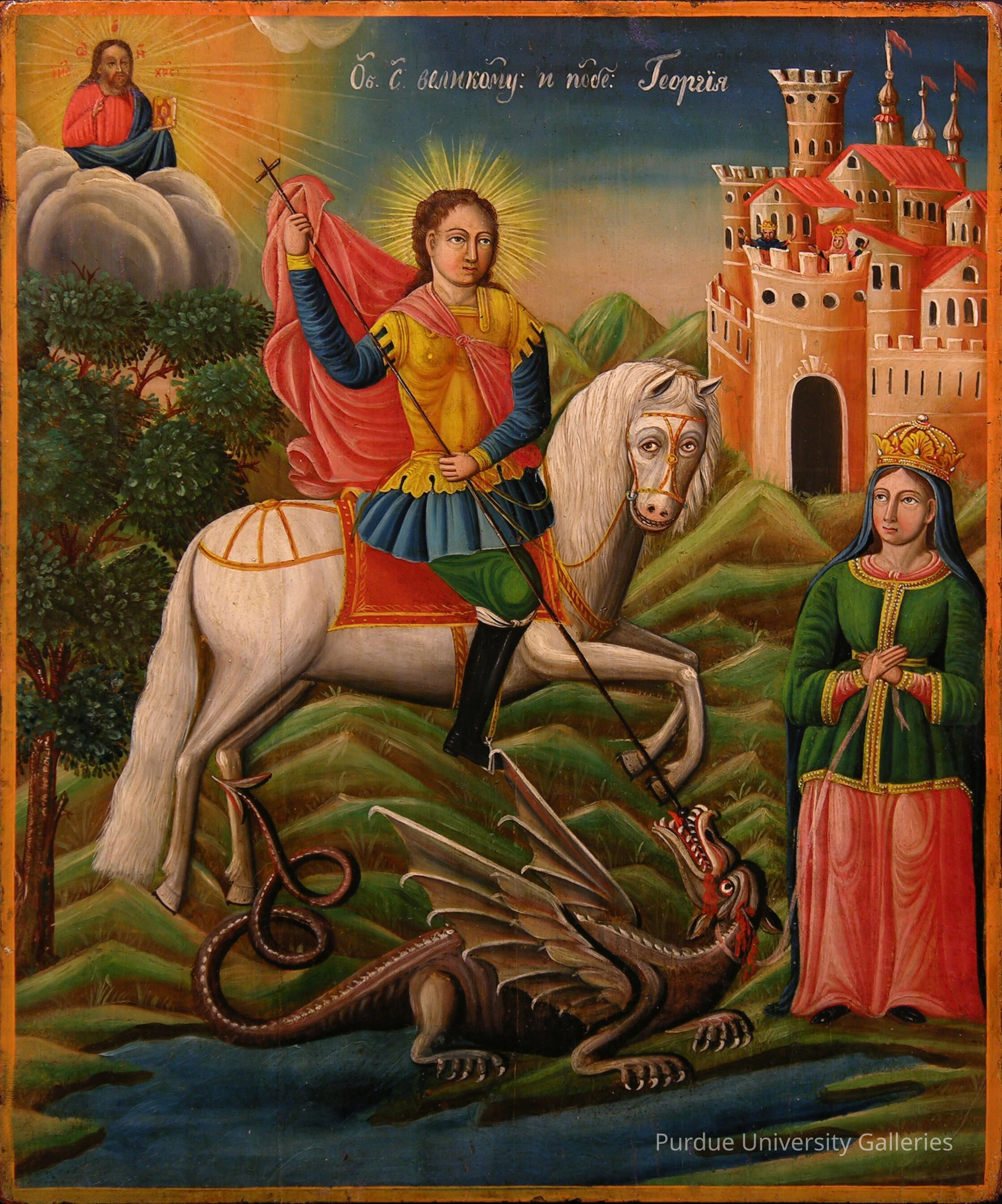 "For the biography of St. George, see 2005.02.047. Here St. George is portrayed in a traditional pose, mounted on a white horse and spearing a dragon as Jesus Christ looks down from heaven, and a fair maiden stands rescued, with the city of Selena forming a partial backdrop. The artist added the city’s king and queen, parents of the sacrificial maiden,