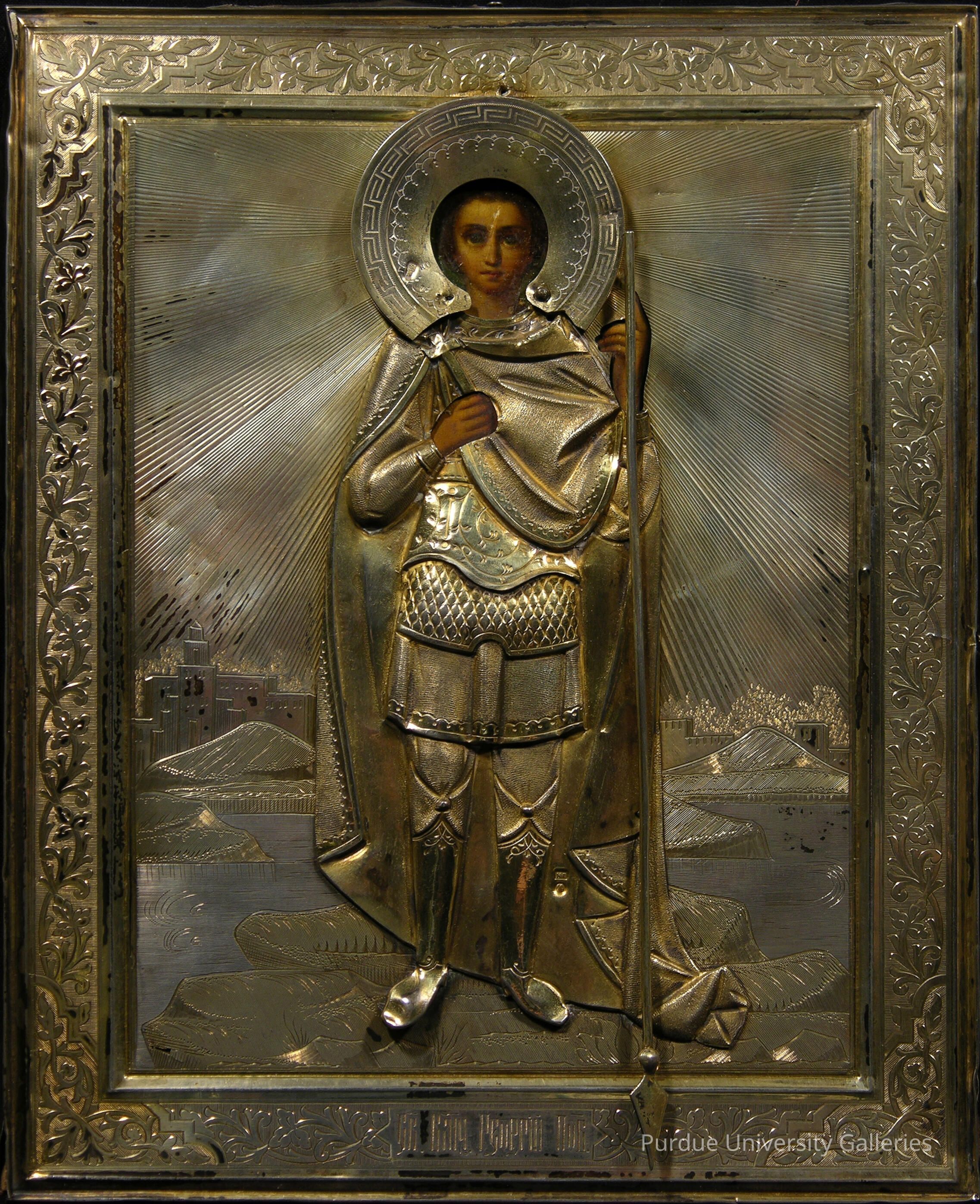 For the biography of St. George, see 2005.02.047. St. George stands in full military dress with the city of Silene visible in the background. His features are soft and he has been given large, round eyes and curly brown hair. Distance is suggested with hills and water seen between St. George and the city, and details include delicate waves, leaves, grass, and even decorations on distant buildings. Attached to the riza is a separate halo with a meander design on its border, and just inside the border is another halo with small ornaments complementing the rays emitted from the halo. The border contains floral scrolls that go well with the armor’s decorative engravings.