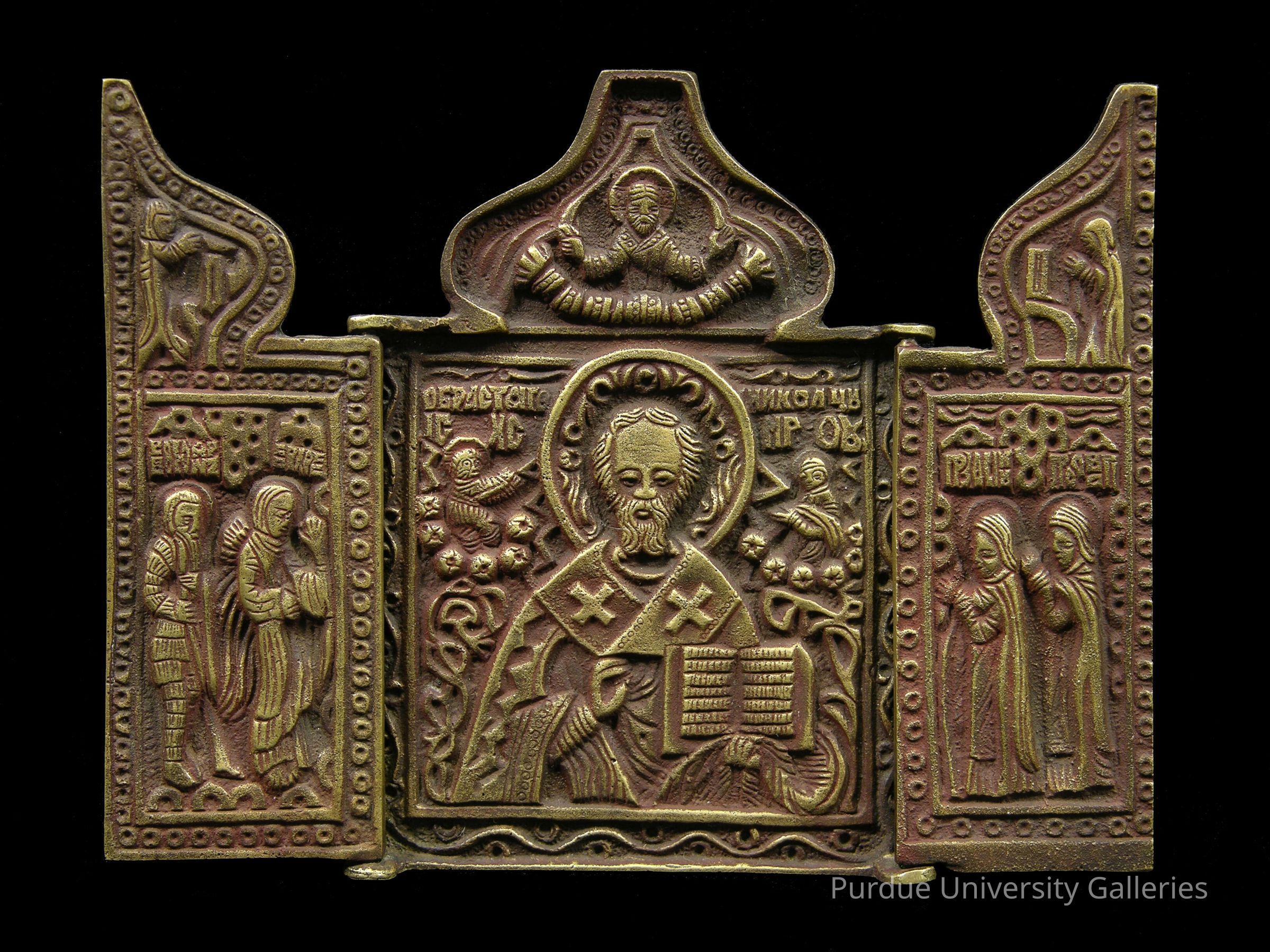For the biography of St. Nicholas, please see 2005.02.066. The triptych features St. Nicholas in the central panel holding an open Bible and flanked by Christ and the Virgin in clouds. God appears in the section above St. Nicholas with his hands spread in benediction and a dove and a crossed halo belonging to Christ immediately below, all reflecting the notion of the Trinity. On either of the triptych’s side panels, other saints turn toward and praise Nicholas. The curvilinear sections above the side panels feature two figures in devotional poses.