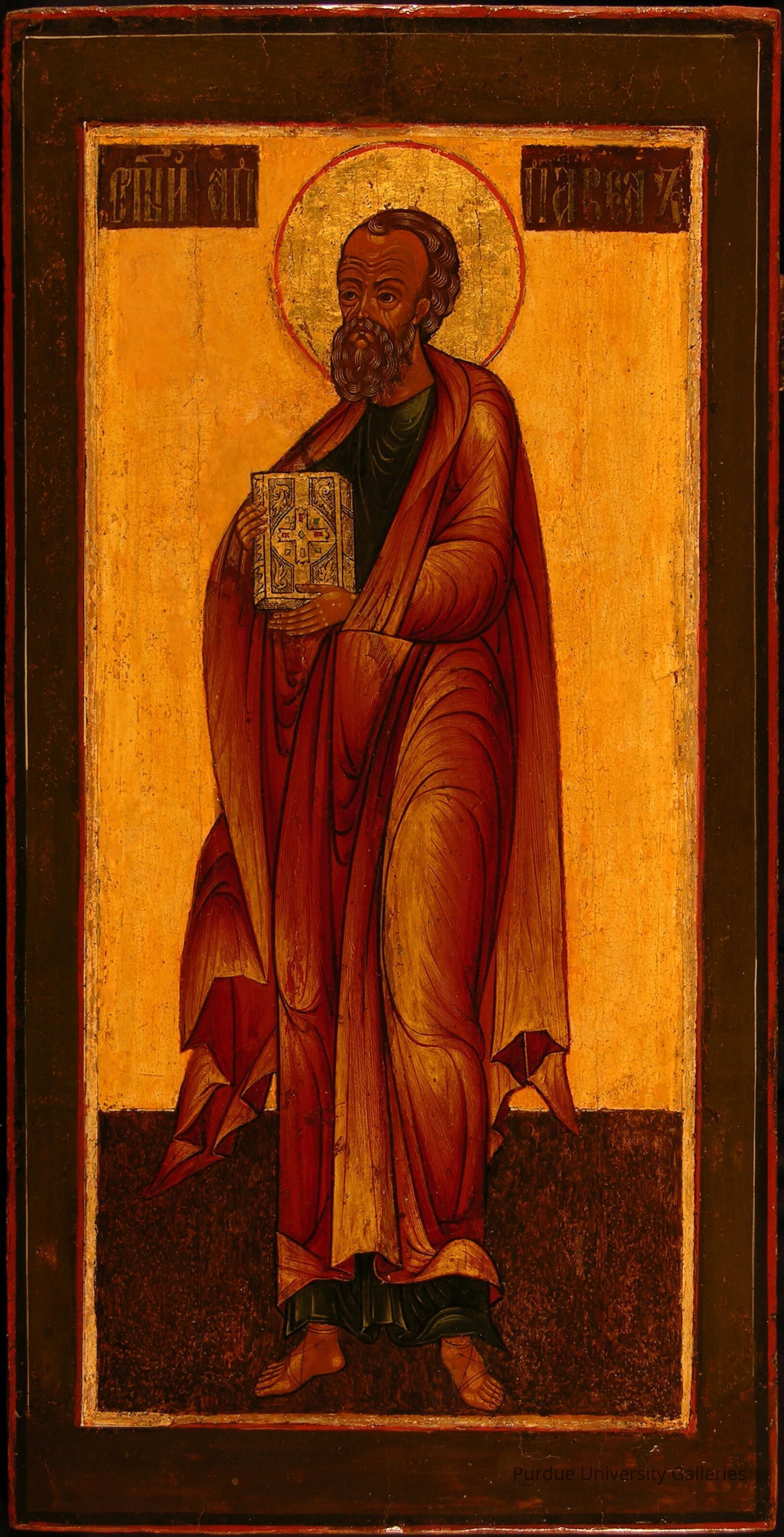 For the biography of St. Paul, see 2005.02.004. In this icon, St. Paul holds the Gospels and stands in a three-quarter view looking toward the viewer’s left. His tall form and neatly drawn drapery reflect the Byzantine style. This panel belongs to a set that includes 2005.02.055, with the result that Sts. Paul and Thomas faced each other as they stood in similar poses.