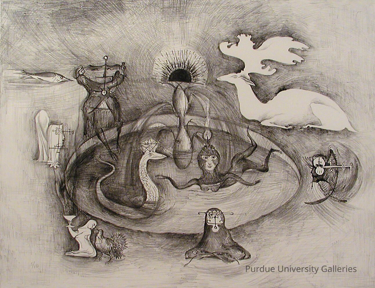Her interest in animal imagery, myth and occult symbolism deepened after she moved to Mexico and entered into a creative partnership with the émigré Spanish artist Remedios Varo. Together the two studied alchemy, the kabbalah and the mytho-historical writings Popol Vuh from what is now Guatemala.