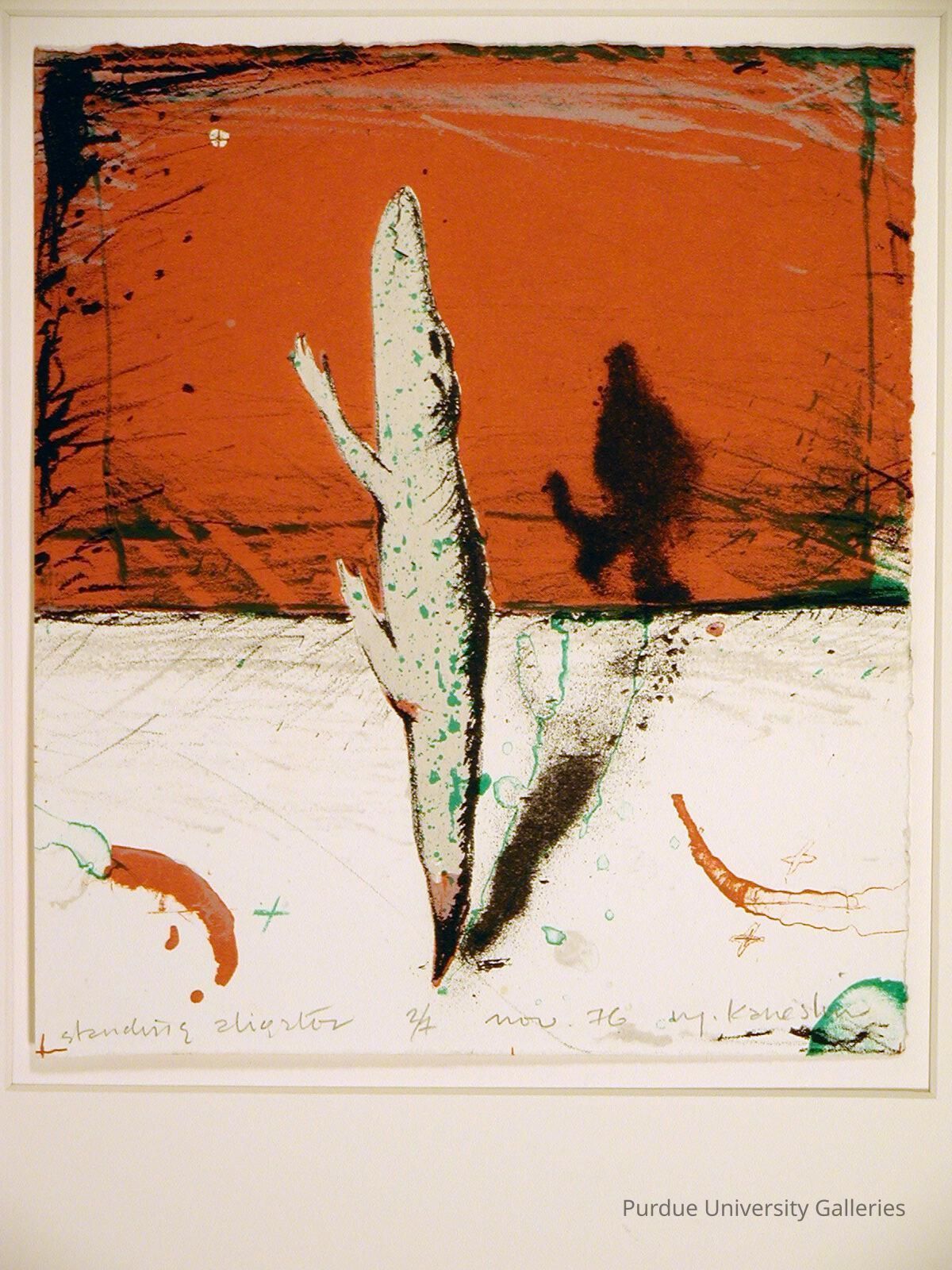This fanciful depiction of an alligator was purchased from the first 60 Square Inches exhibition of small prints, which continues to this day as a biennial competition for artists working in printmaking media. Robin Kaneshiro is currently a faculty member at the City College of San Fransisco. (2004)