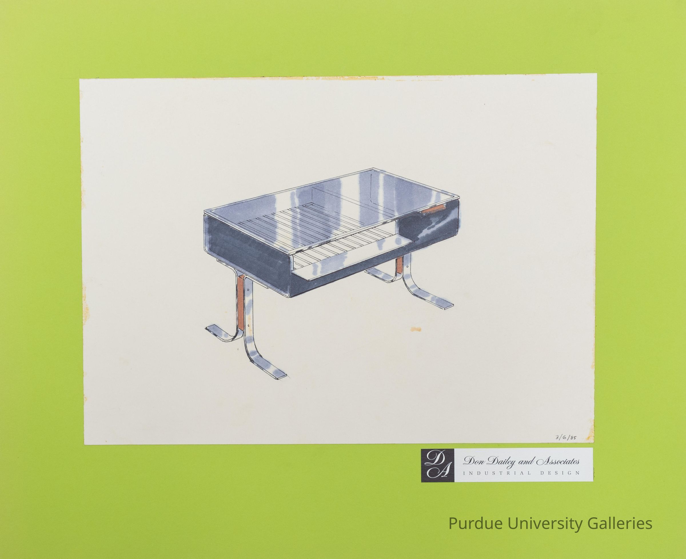 a design drawing of a steel grey desk that has a clear glass top and storage area built into the desk itself.Type of Drawing