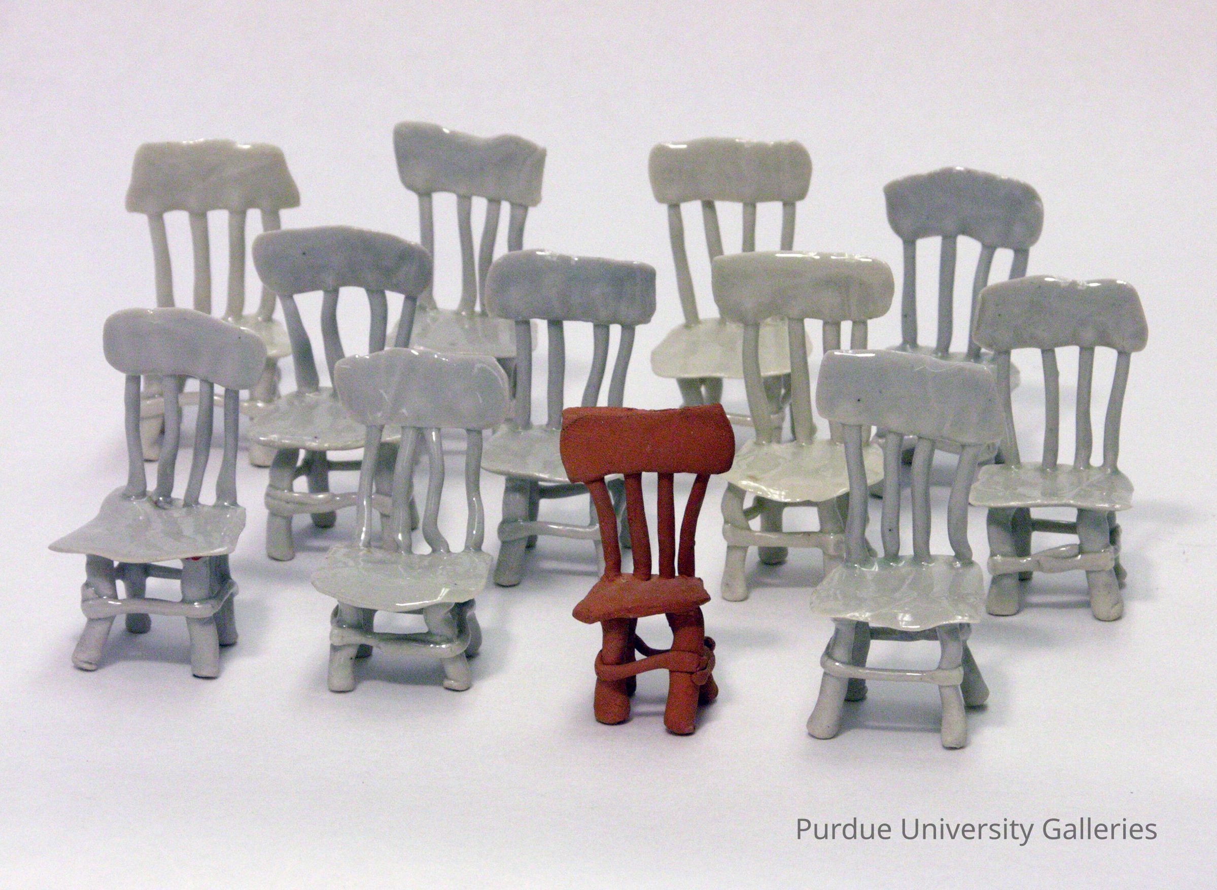 There is an array of 12 miniature clay chairs standing next to each other. They all look hand built and the sculpture decided to go with a more deformed look rather than realistic and straight chairs. Out of the 12 one is a deep red and looks less glossy as the other white chairs. The white chairs seem to be covered in a deep and thick glaze. The red chair looks unglazed, and the texture of the clay goes through. You can see the corners better in the red chair. No chair is made the exact same way.Type of Sculpture