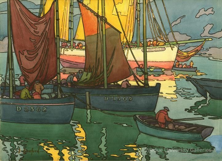 Though a talented artist in her own right, Purdue Graduate and Indiana native Florence Lonsford is best known (at Purdue University at least) as a generous benefactor of the arts. Lonsford was a self-taught artist who exhibited her paintings, sculptures, and prints in exhibitions at home and overseas. Sunset with Boats demonstrates Lonsford’s keen sense of color and line.