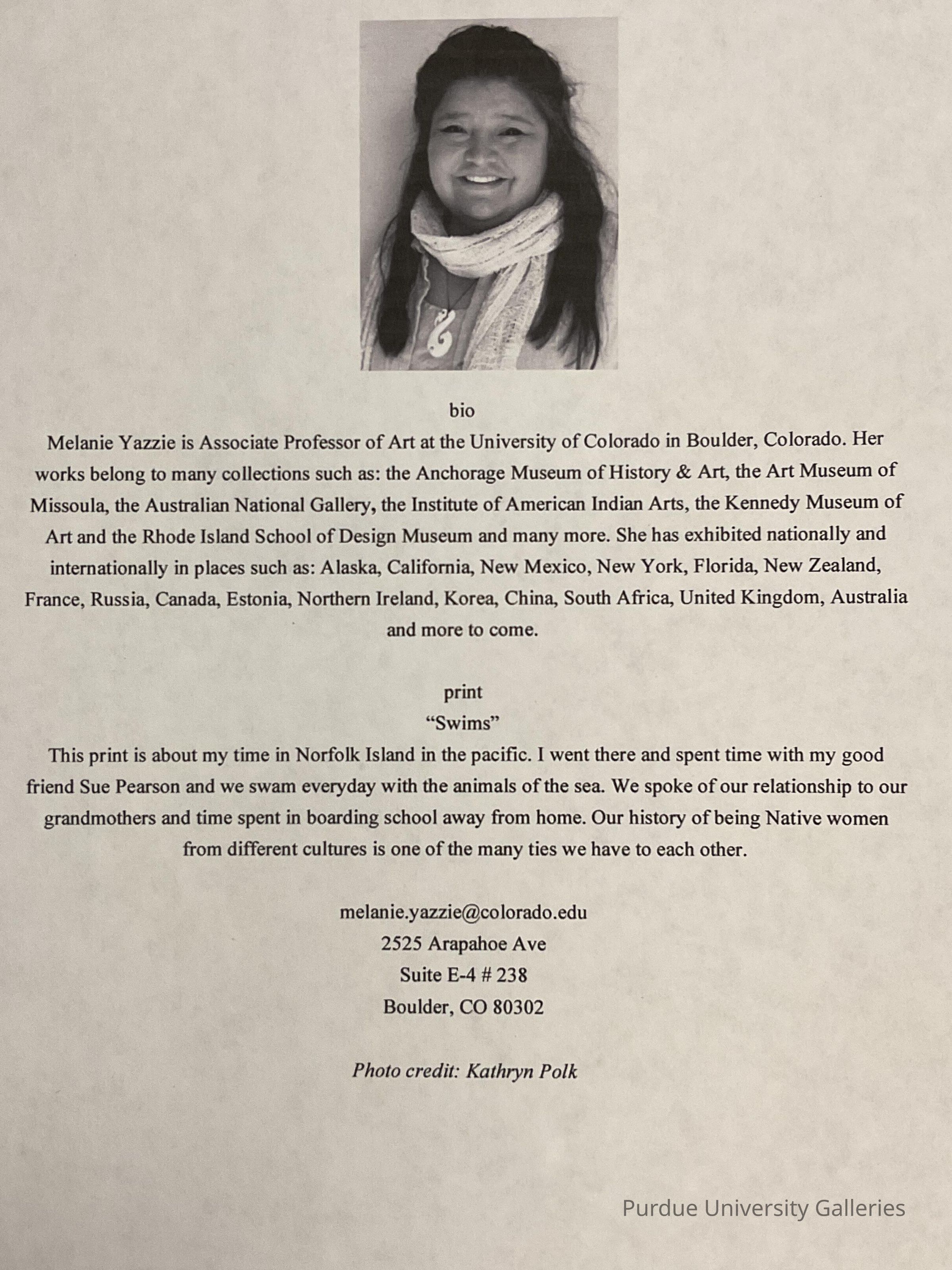 Double sided print folded in the center along the short edge. Exterior is printed in a light, cream color with water creatures (turtles, octopus, etc. . .) among waving lines. At bottom, left printed in pencil “SWIMS”, “13/20” is penciled to left of fold and artist’s signature is in bottom, right “Melanie Yazzie.” Interior is printed in green as a mirror reflection of the exterior print.Collection