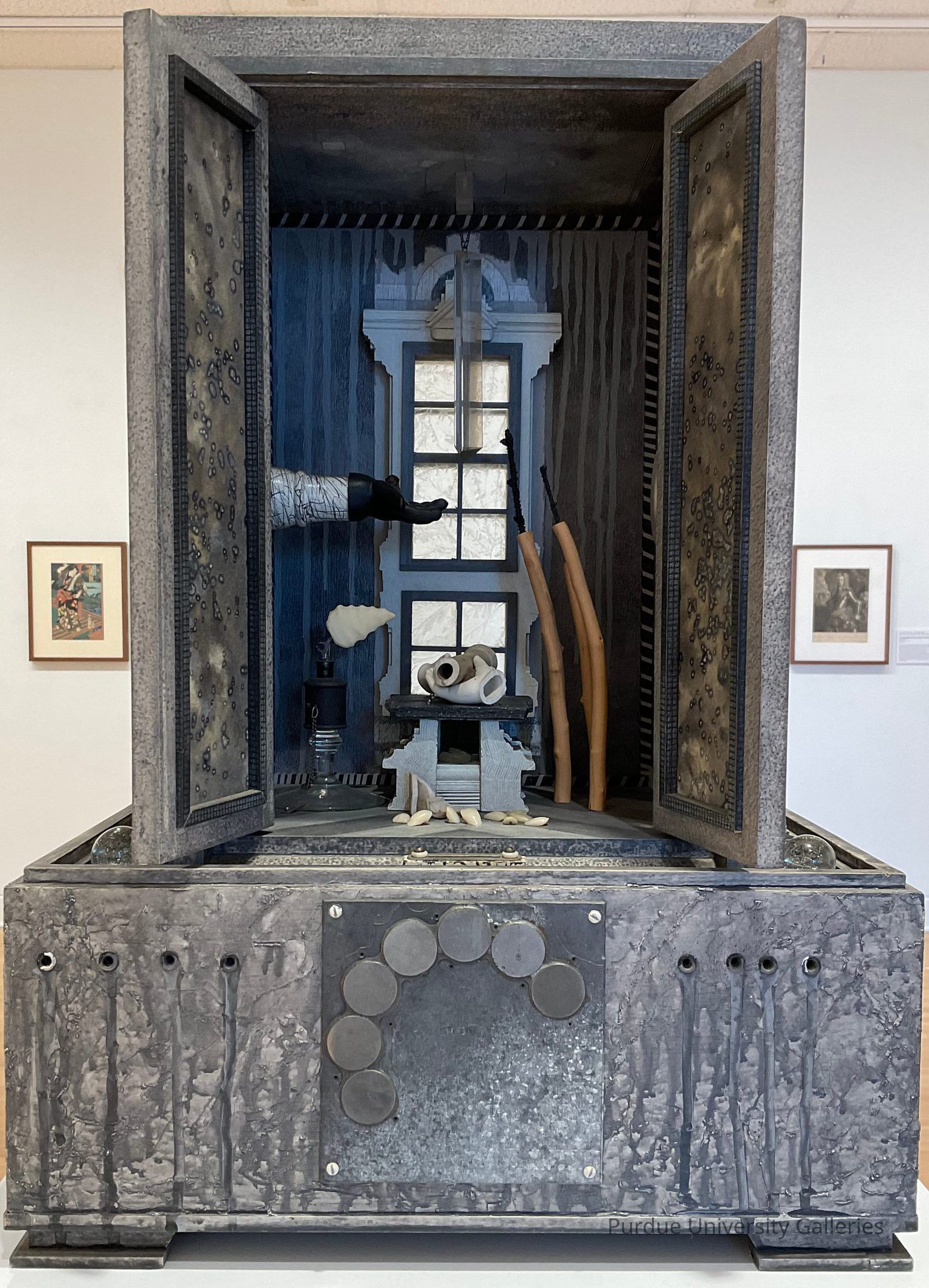 Ferringer produced small box-like works such as this one. It has the appearance of a crypt, a stage, a doll house, and a religious altar with its wings opened. The inclusion of the hands and use of gray creates a sense of uncanny surrealism.