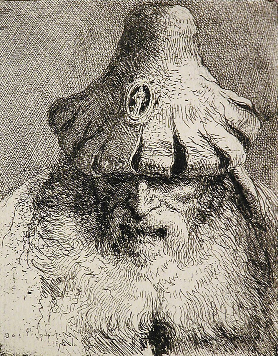 Forever influenced by his master, the “Punch” works – evidently a striking departure – may derive obliquely from Giambattista. Battista owned an album of 17th-century French costume-design, stemming from Commedia, from which he drew fanciful figures/heads made-up like magicians or philosophers. Purdue’s Domenico etching of the bearded man, “Teste (Head),” though it recalls the father’s work, shows Domenico’s skillful draftsmanship and his cognizance of etching’s unique qualities.