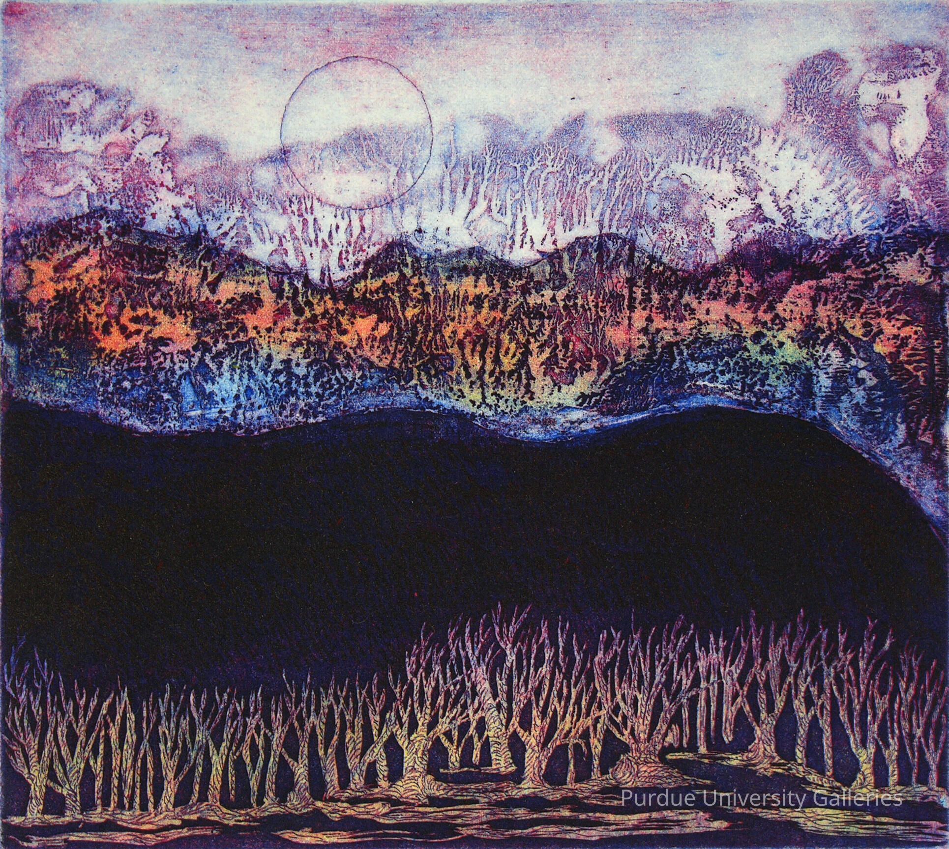 This print is a landscape, a favorite subject of the artist. In an artist’s statement, Hess said: “I see texture, shapes, and space in nature. Landscape is an excuse for making an etching.” In the foreground of the print is a line of leafless trees. Then there is the dark line of a mountain followed by tree-covered mountains. There are many layers and levels to the mountains and above is the sky, with trees breaking the horizon line; one also sees a moon on the left. A wide range of colors is used, including light and dark blue, orange, yellow, purple, red, white and pink. Most of these appear in the mountains, and the trees are colored mainly yellow. The sky is a mixture of purple and blue.