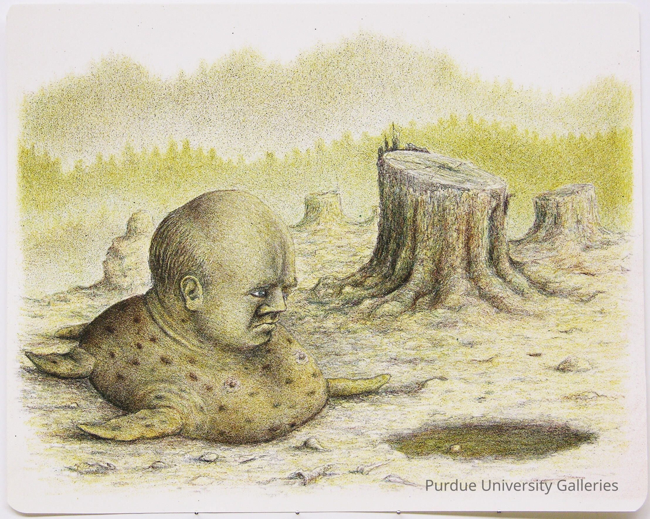 The image depicts a half-man, half-animal creature with fins and the tree stumps behind him.