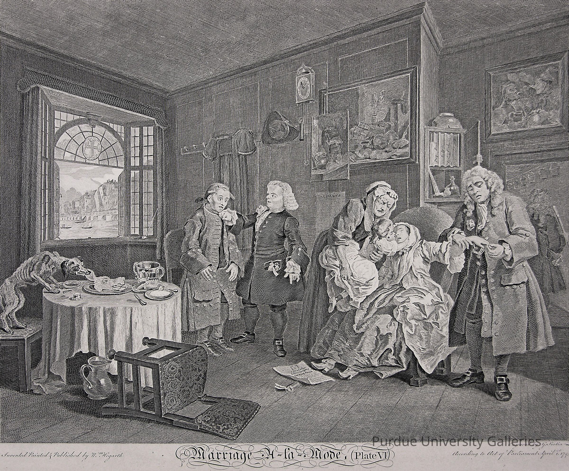 Plainly dressed, she expires on a chair as an ineffectual physician scurries away. On the floor lies a bottle of Laudanum; next to it the precipitating cause of her suicide, Counseller Silvertongue last Dying Speech. As her impassive, mercenary father dispassionately removes the ring from her finger, a withered old nurse holds her daughter for a dying kiss. The crippled girl has inherited both her father's venereal disease and his beauty spot; since the young Earl has no male child, his family line has ended. The apothecary, who has a stomach pump and a julep bottle in his pocket, points to the empty laudanum bottle, and berates the servant who looks at it uncomprehendingly. The fellow, who wears his master's ill-fitting coat buttoned askew, is an idiot hired cheaply by the alderman.