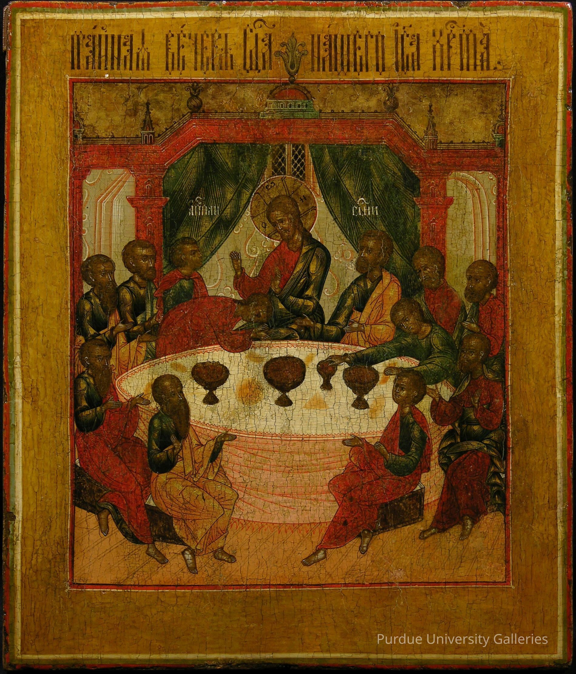 This icon representing the Tainaya Vechera or “Mystic Supper,” shows Christ at the center of a round table surrounded by his disciples. Judas is recognized as he reaches into a bowl on the table. He lacks a halo, as do the other apostles. The latter all gesture toward Christ, who has raised his hands in blessing. The presence of a curtain and an intricate architectural background indicate the scene takes place in the interior of a building.
