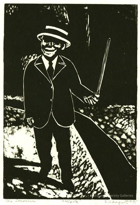 Black woodcut relief print of man walking. The mark making in the piece creates shadows from the negative space adding dimension to the street and figure.Type of Print