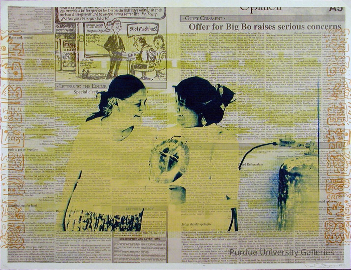 Thelma and Me contains a photograph of two women, presumably Navajo, superimposed on an issue of the Navajo Times. The newspaper articles feature modern concerns of the Navajo such as fighting stereotypes and the selling of land. The women shown are linked to some type of basket that resembles a traditional Native American vessel. On both sides of the print are stamps that appear to be Native American icons and figures of presumably Navajo or even specifically Diné origin, since that is generally Yazzie’s focus.