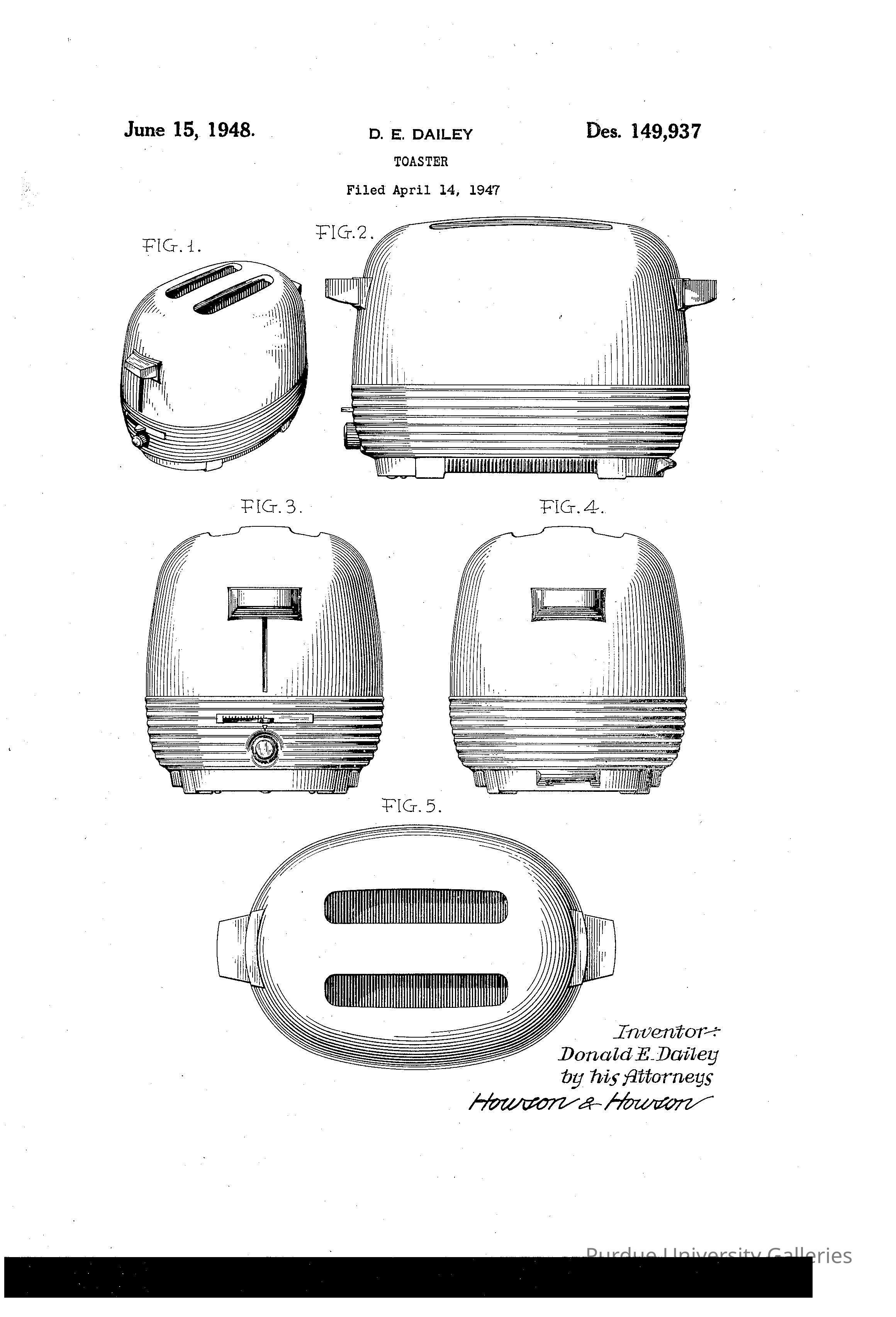 Rounded, metal, two-slice toaster. One side has a plastic handle and the other side has a plastic slider to toast the bread. The power cord is wrapped in cloth. There is a plastic handle on the bottom that can be pulled to remove the metal tray that holds bread crumbs. A knob on the side adjusts the "color" of the bread.