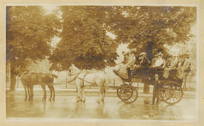 The photographer captures the tour group on a carriage in a side profile view. There are five rows of seats which allow for around four people in each row. Most people look at the camera but none of them smile for the camera. There is a man on the ground which shows the scale of the carriage; the carriage is almost a man and a half tall while the horses are Percherons. The wet street shows rainy days around the time the image was taken, and trees in the background line the road.Photograph Details