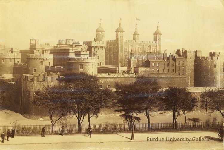 The image captures the Tower of London. The castle is a massive piece of architecture with many layers of walls before getting to the main castle body. The image is captured from across the street as there are people on the sidewalk that appear tiny which demonstrates the scale of the castle.Photograph Details