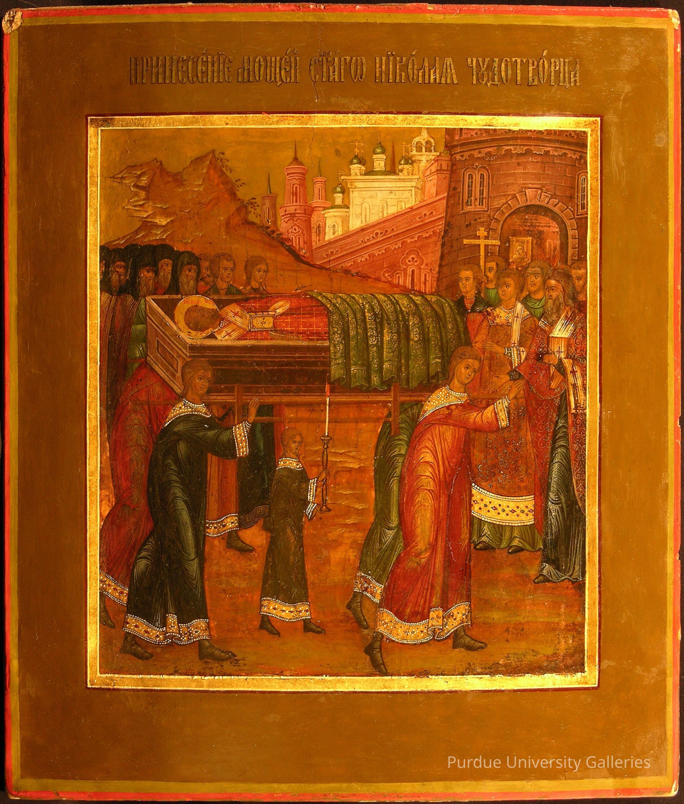 For the biography of St. Nicholas, refer to 2005.02.066. St. Nicholas’s relics are shown being moved by a procession of holy men to the city of Bari, Italy, visible in the background, in order to avoid desecration by the Muslims. Lavish use of gold and red, the presence of elongated figures, and little evidence of perspective reflect the Byzantine style effectively. A tri-bar cross appears in the crowd and on a building in the background. Through the archway an icon of the Virgin Eleousa can be seen.