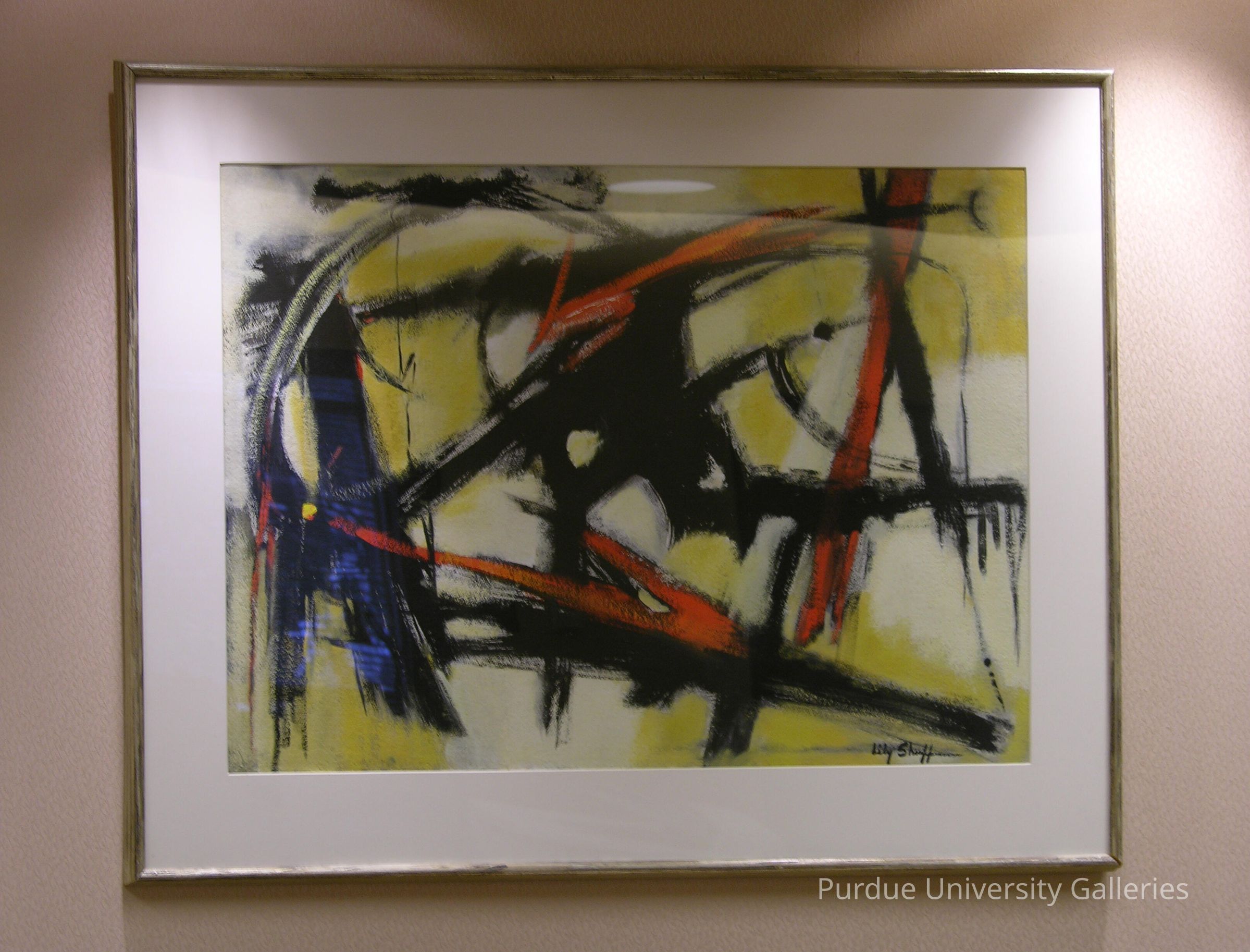 This abstract painting has thick black, red and blue lines. Yellow and cream make up the background blending the colors within each other. They seem quick and fast, yet intentional.