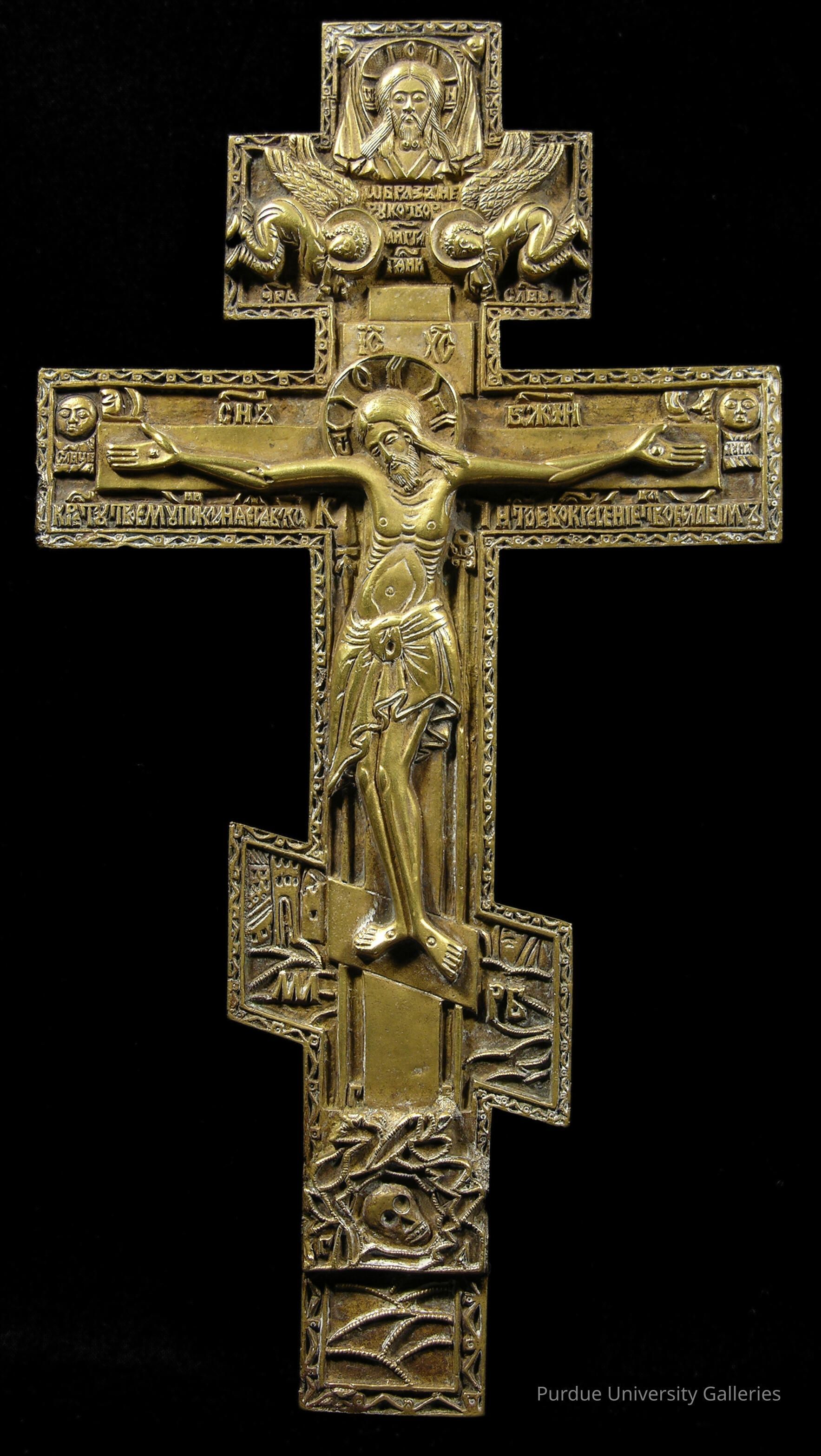 Bronze crucifixion cross in the Eastern Orthodox/Greek Orthodox tri-bar style with the additional horizontal line at the top and diagonal line near the bottom. The top bar shows a bearded man with long beard and mustache against a halo shrouded on the sides with cloth detailing. Two angels pose below him flanking a caption written in the Russian Cyrillic alphabet. Below, Christ is nailed with hands outstretched in loincloth and gold halo. There is fine detailing in his ribcage and stomach area. Additional Russian captions sit along the bar under his hands, as do circular renditions of the sun and moon. In the bottom half of the cross, the letters МЛРБ (MLRB/"Mesto Lobnoe Ray Buist" or "The Place of the Skull Becomes Paradise") sit on either side of the diagonal line. Below that sits a human skull in foliage.Type of Painting