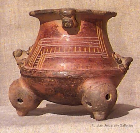 Tripod Vessel with rattles in the feet, small looped handles at the rim and incised geometric decoration on the body.
