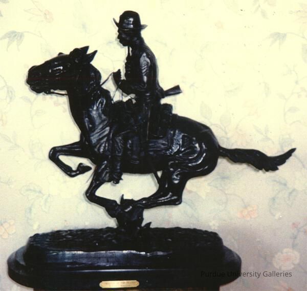 "Remington had such success with his first version of The Bronco Buster that he decided to produce a second one half again as large as the first. He wrote to Bertelli at the Roman Bronze Works that “this size lends itself to my hand much better than the smaller.”1 When the model was finished he sent off an enthusiastic note to the foundry. ""Say Bertelli, you ought to see the 11/2 Bronco Buster -- It will make your eyes hang out on your shirt. Get ready to retire the small one -- mind you.""2 1 Letter from Remington to Riccardo Bertelli, undated (1909), in the collection of the R. W. Norton Art Gallery, Shreveport, Louisiana. 2 Letter from Remington to Riccardo Bertelli, undated (1909), in the collection of the R. W. Norton Art Gallery, Shreveport, Louisiana. ------ 1999.13.01 & 1999.13.09 Frederic Remington was defined by the Old West. His obsession with the lives of countless Native Americans, cowboys, and military men drove him to attempt to recreate with vivid details the drama and danger of their daily life. Not surprisingly, he focused on equestrian due to their inherent danger and beauty. Several of his bronze sculptures represent horses and horsemanship in their finest details. Remington enjoyed great success despite the fact that he had very little formal training in sculpture. He extended the possibilities of what bronzes can show as demonstrated by The Outlaw: the artist relished the challenge of pushing boundaries. He wrote to the head of the Roman Bronze Works, Riccardo Bertelli, a post card with a sketch of a bucking horse and rider and under he wrote this conversation, “R: ‘Can you caste him?’ B: ‘Do you think I am one of the Wright brothers?’” Remington took a realistic view in The Outlaw. The cowboy sits leaning backward precariously on his steed struggling to maintain his balance and control, as his steed rears right into the curve. The riders face is frozen in a determined and confident expression, while in contrast the horse is frantic with energy and terror. The arching lines of the sculpture convey the excitement of the action, with the cowboy twisted in his saddle. We have the illusion that the bronze is alive and simply frozen at the peak of drama. Frederic Remington used realism extensively throughout his bronzes. The textures and details of the rider and horse are painstakingly depicted by Remington. He wanted to bring his idea of the Old West to the modern world of the East Coast. Like most of his other works, The Outlaw demonstrates Remington’s careful attention to the anatomy horse movement and the riders mastery over them. Frederic Remington created The Outlaw as a companion pieces to the The Broncho Buster. They are like a teeter-totter, creating a fluid flow from the start to finish of the horses bucking motion. Bibliography: Remington1960: [PAGE #s]; Hassrick 1973: [PAGE #s] ; Shapiro1981: [PAGE #s]; Hassrick 1988: [PAGE #s]; Remington 1993: [PAGE #s]; Nemerov1995: [PAGE #s]; “Frederic Remington (1861-1909).” http:// www.christies.com/LotFinder/lot_details.aspx?intObjectID=5154232; Amon Carter Museum, “Works of Art.” http://www.cartermuseum.org/works-of-art/1999-22 Submitted by Eric Engle"