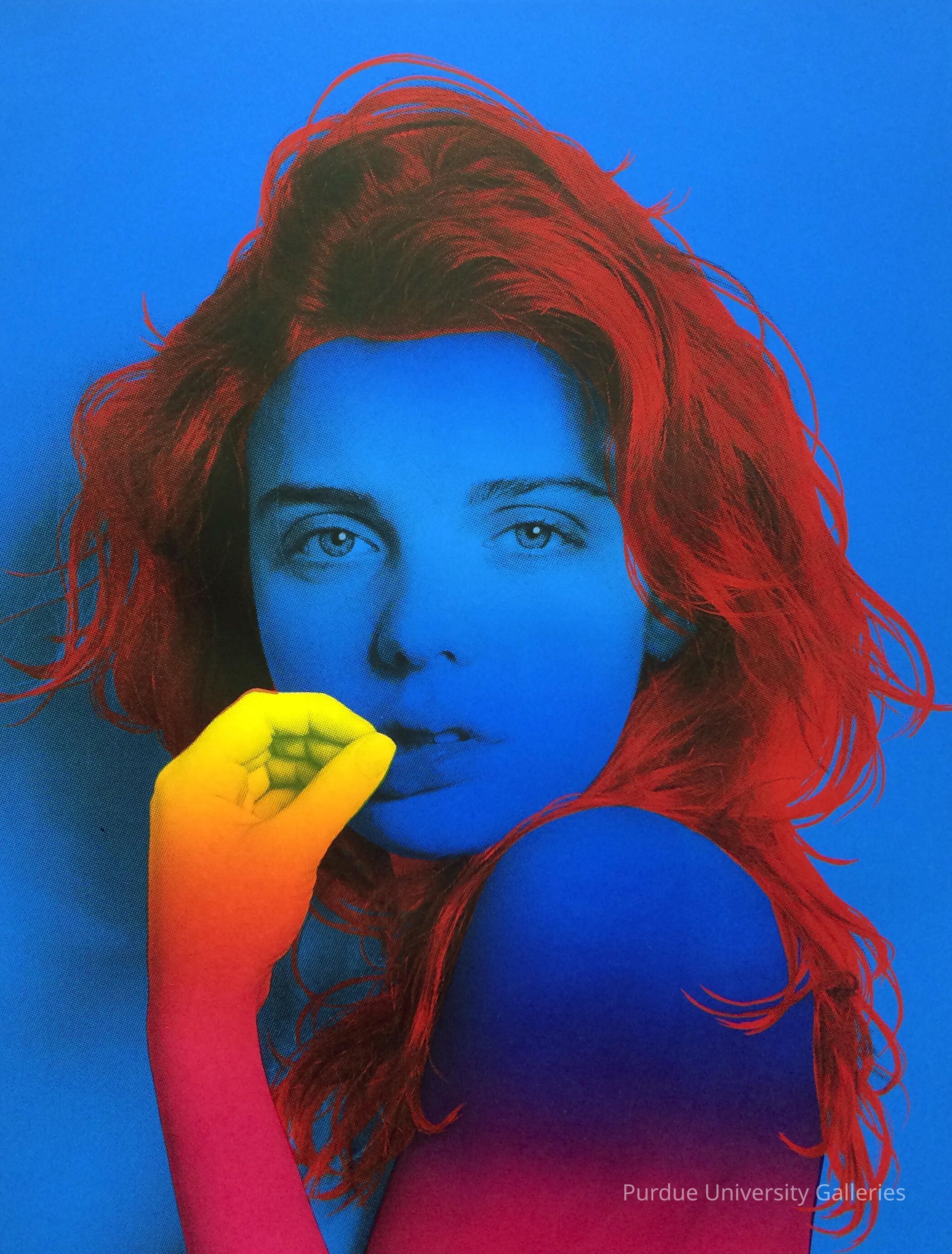In True Blue, Morgan has rendered the image of Siri, a favorite muse and model, in deep blues, reds, oranges and yellows. The colorful and graphically striking image evokes psychedelic posters of the 1960s and the serial screen prints of pop artist Andy Warhol.