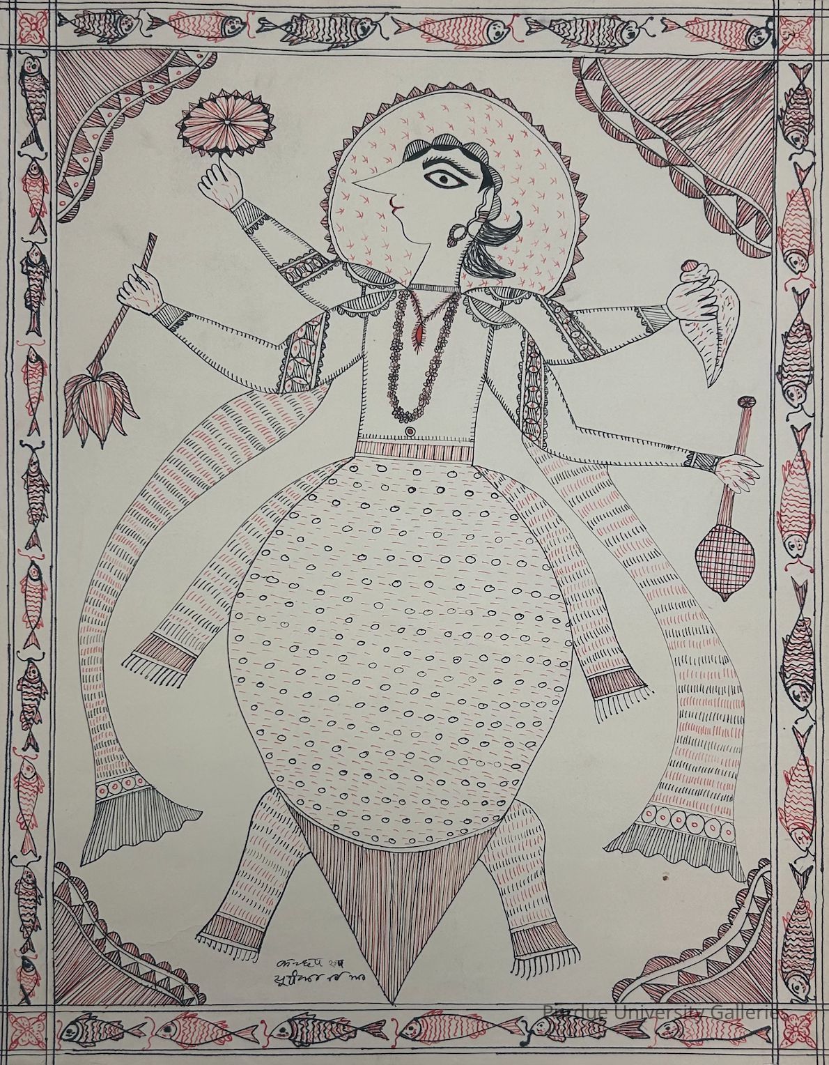 The central figure is depicted with multiple arms, each holding various objects, including a lotus, a conch shell, and a staff. The figure wears detailed attire, with intricate patterns on the clothing, and is adorned with necklaces and jewelry. The figure’s body has a distinct oval shape, with the lower portion resembling the form of a turtle shell.Type of Painting