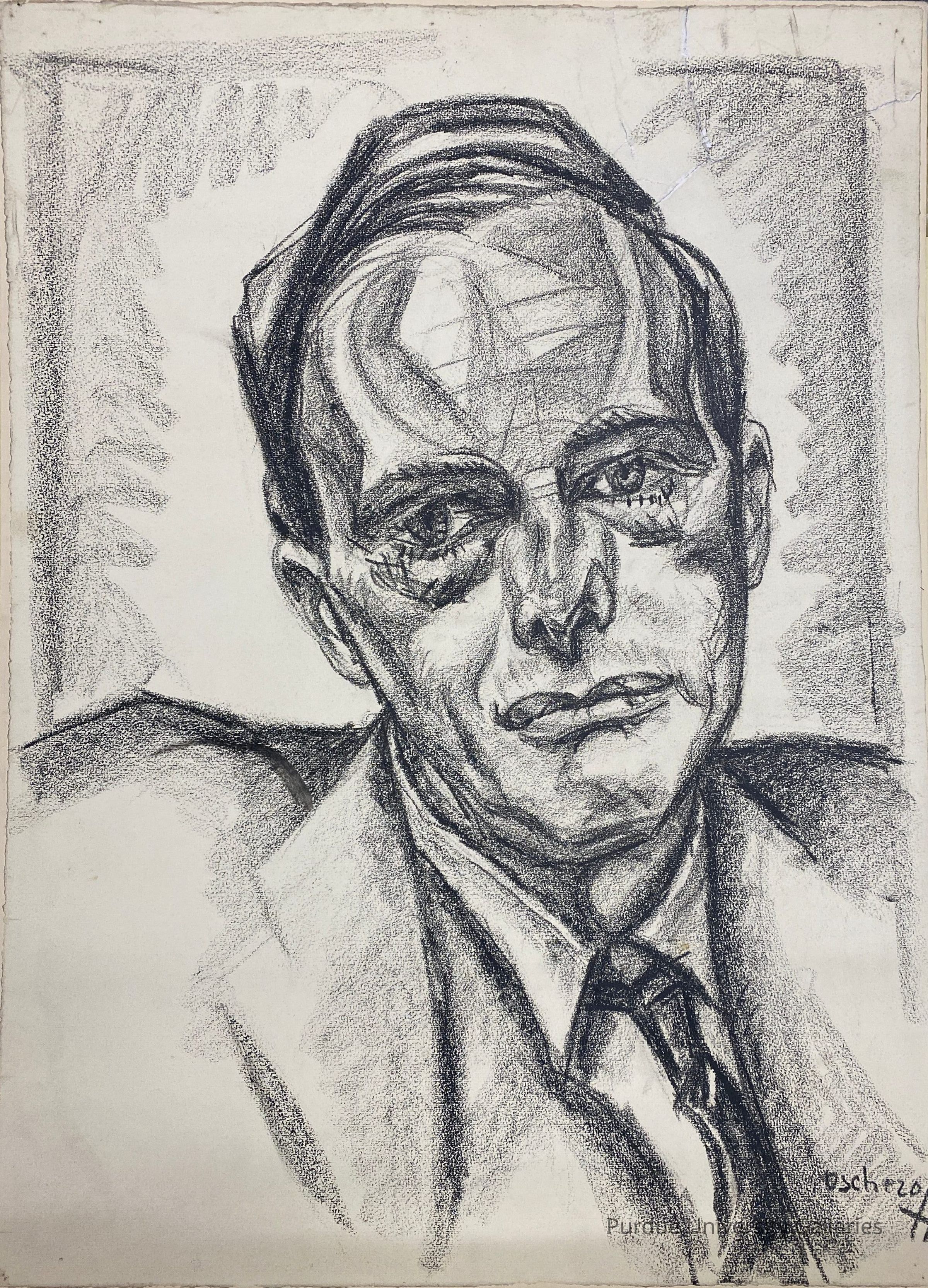 Drawn portrait of a man staring straight at the viewer.Made/Created