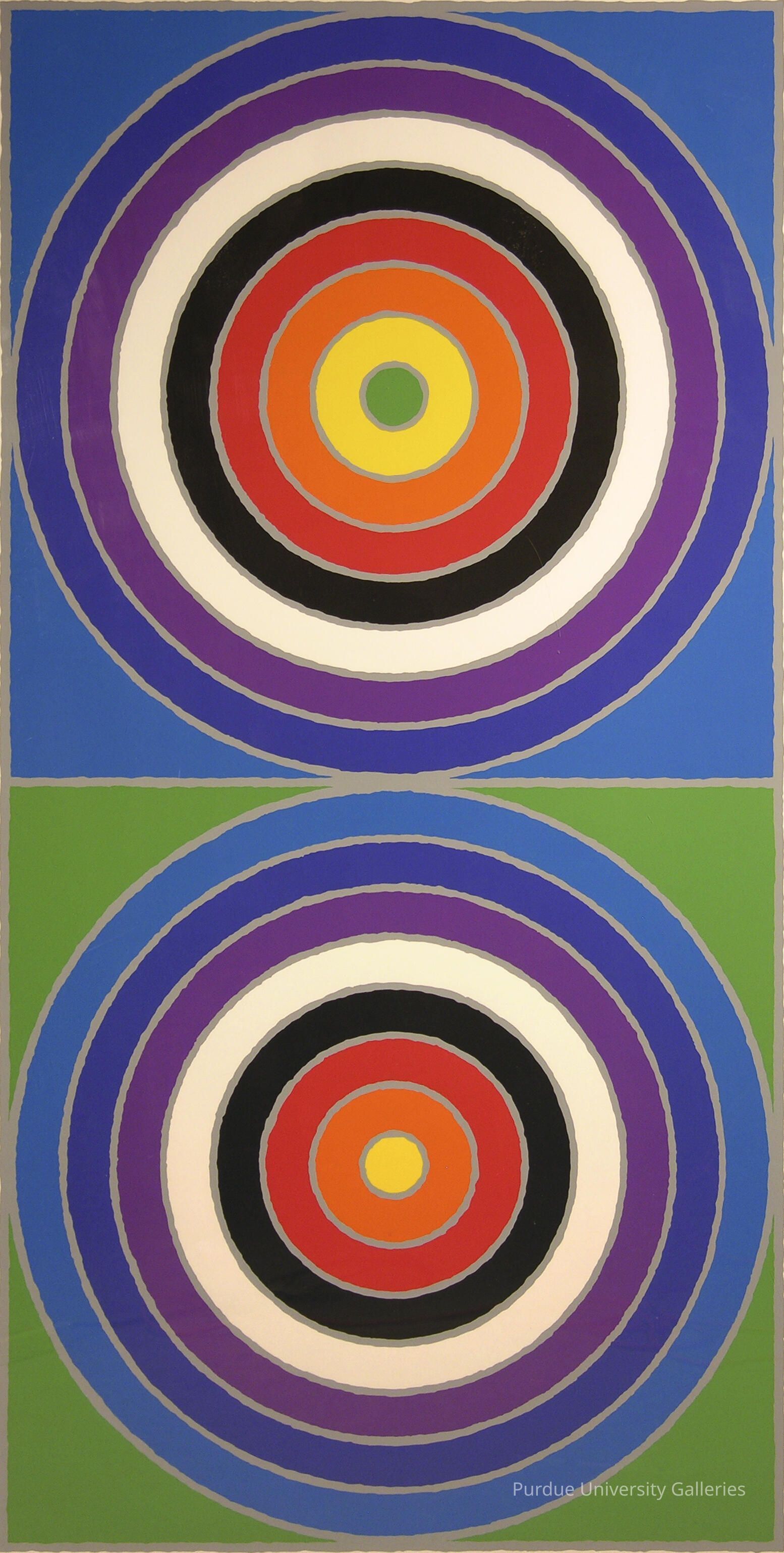 Two square sections with concentric circles (8 circles per). The colors from the bottom alternate to the presentation of the top panel, with the green center circle coming out to the background, and the yellow following to be the most interior circle etc. The colors included are blue, indigo, purple, white, black, red, orange, yellow, and green. The colors on top move outwards with the green transitioning to the back and every color coming in towards the center one. The composition is very well balanced with the circles being equal in thickness, and the colors being used create a visual harmony. The piece is two-dimensional, and the emphasis I would say is on the color, and the movement outward.Type of Print