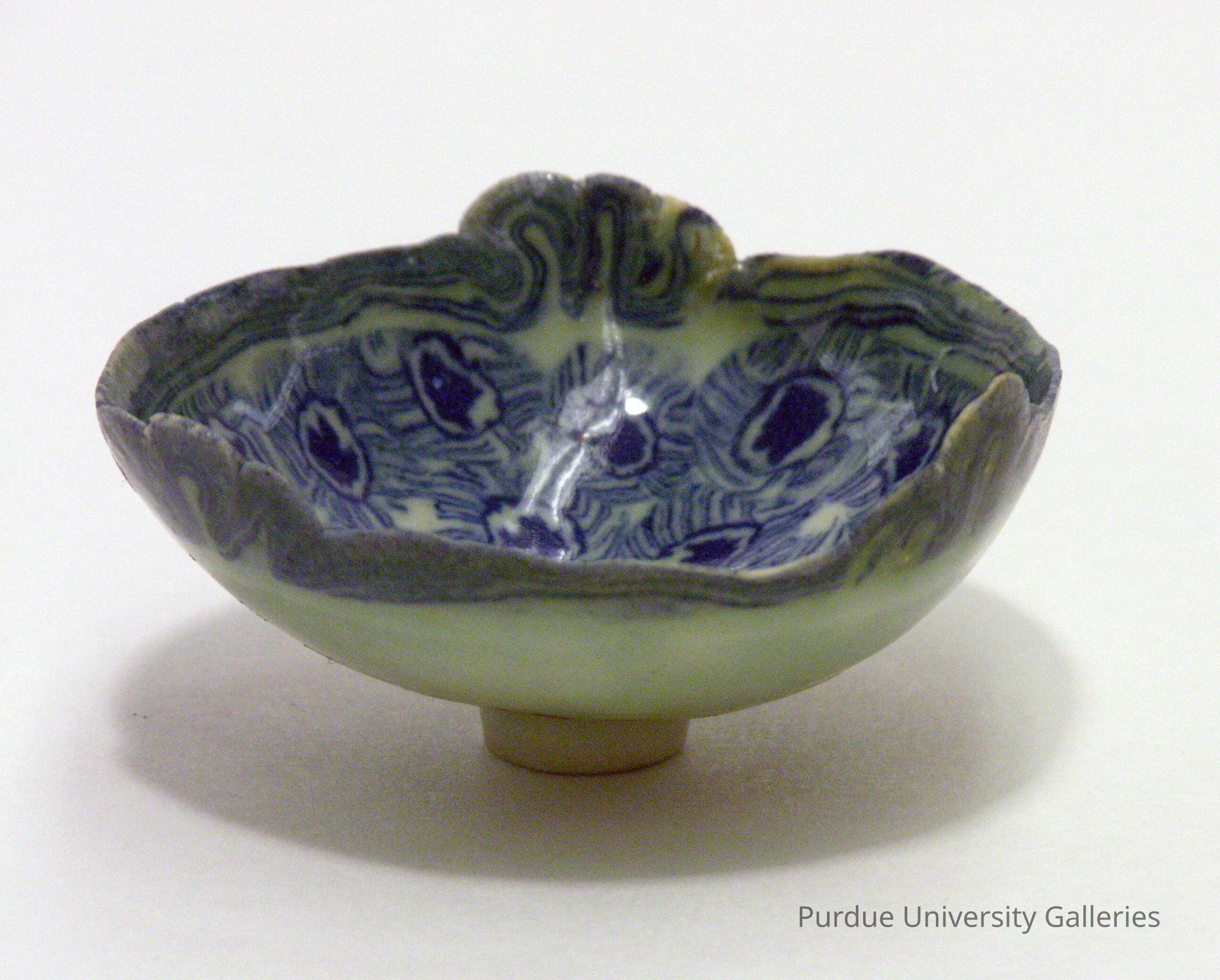 A ceramic bowl with a tiny base. It has a deep and wide bowl with a swirl of blue in the middle. The swirl extends from these abstract ovals and the rim of the bowl also has the line swirls. The exterior of the bowl is a blank cream with no lines.Type of Sculpture