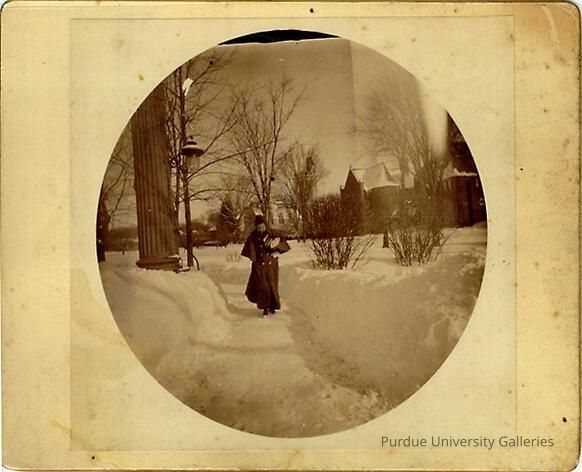 A cabinet card was a style of photograph which was widely used for portraiture after 1870. This image depicts a woman holding a stack of books in the winter, as she walks through a snowy path. It looks like she is at some kind of school, with the grand buildings behind and the the right of her.