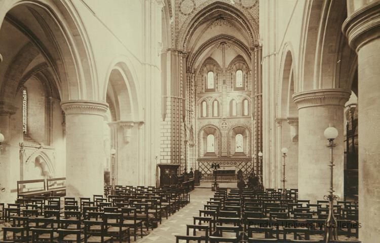 The image captures the inside of a church. There are rows of chairs lined up with a small alter. The ceiling are vaulted high with intricate detailing in the pillars and arches.Photograph Details