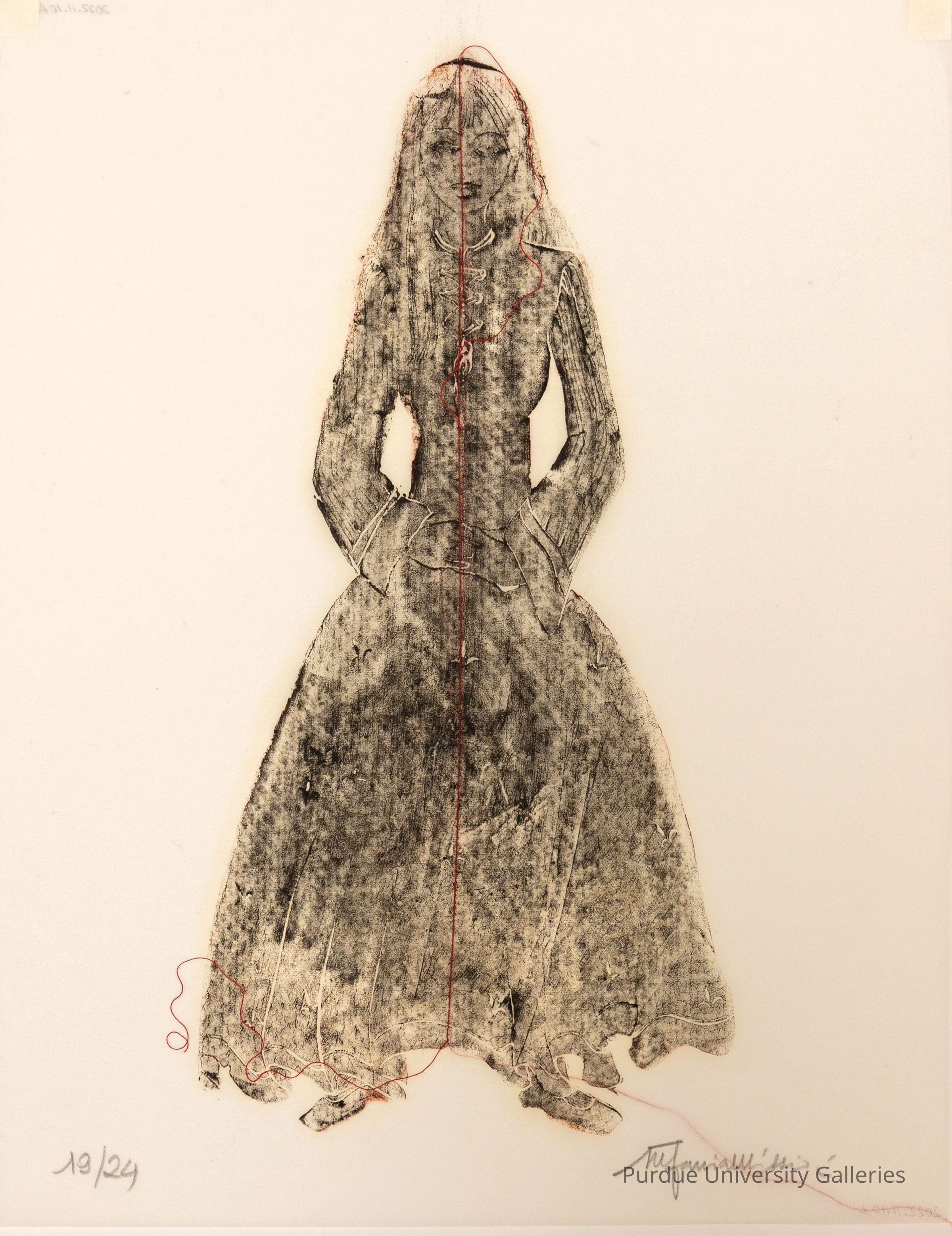 Print of woman in a long dress and sleeves, her hair is down. A red thread runs is stitched down the center from the top of her head to the hem of her dress. The print ink is in black. Under the print in pencil is "19/24" and then the artist's signature.Type of Print