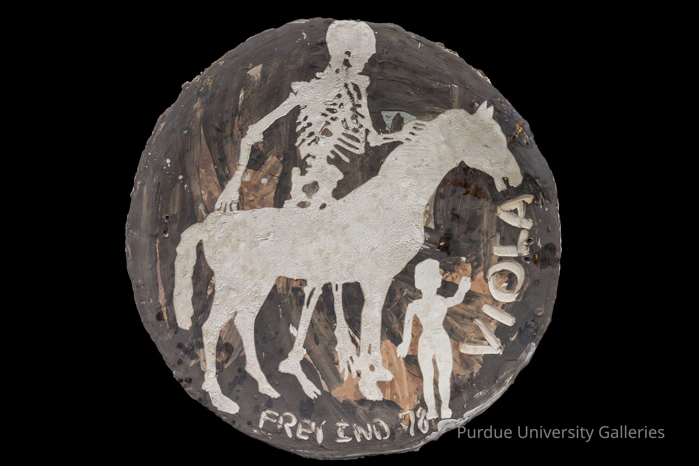 Silhouettes of a skeleton, horse and woman