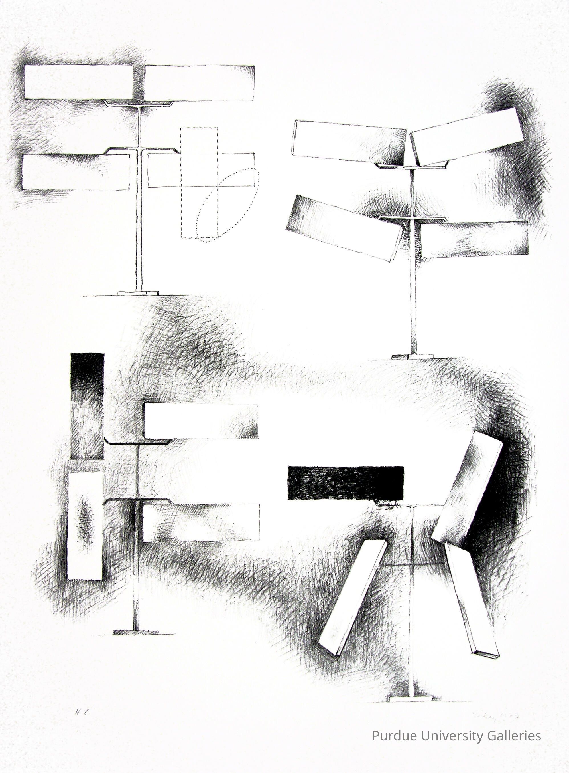 "Rickey was born in South Bend, Indiana but spent his youth in Scotland. He received a degree in art history at Balliol College, Oxford, and studied art at the Ruskin School, Oxford, . He also studied with Andre L'hote in Paris, at New York University, Iowa State and the Institute of Design, Chicago. From 1930 on, he taught in various universities including Indiana University, Tulane, the University of Washington and the University of California. Until 1950 he was known primarily for his painting, including murals for Olivet College, the U.S. Post Office at Selinsgrove, Pennsylvania and Knox College. Since then he has devoted most of his energies to kinetic sculpture. They are designed to be situated out of doors and to rely on air power for their motive force. The present work is a study for one of these sculptures.