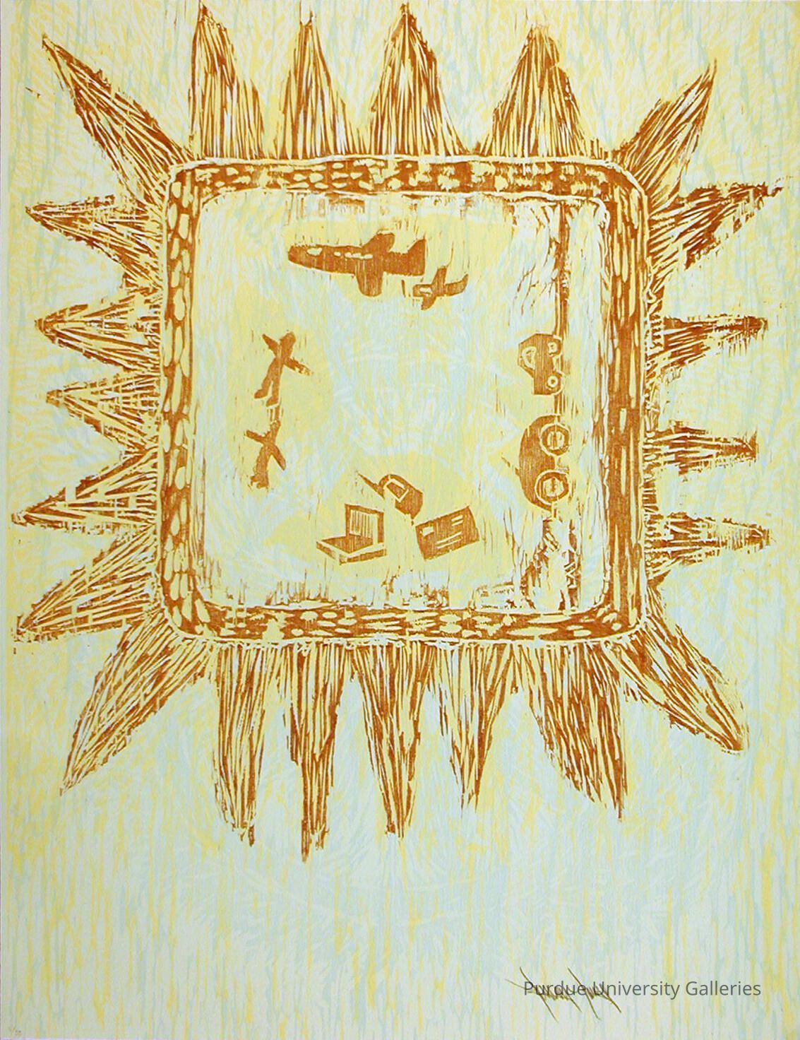 Truman Lowe’s Sun Form illustrates a brown square edged with triangular shaped, sun-like rays extending around the square’s perimeter. Within the square there appear to be random shapes symbolic of a computer, letter, cellular phone, airplanes, automobiles and figures that all have the consistency and contrast of texture typical of woodcuts. These shapes and symbols rest above a light blue, yellow and green ground that could be symbolic of moving water also emphasized by the woodcut’s texture. These elements refer to the artist’s love of natural materials and water. Lowe’s work is very rich and complex and the symbols within Sun Form create a metaphor appropriate to our generation and the future.