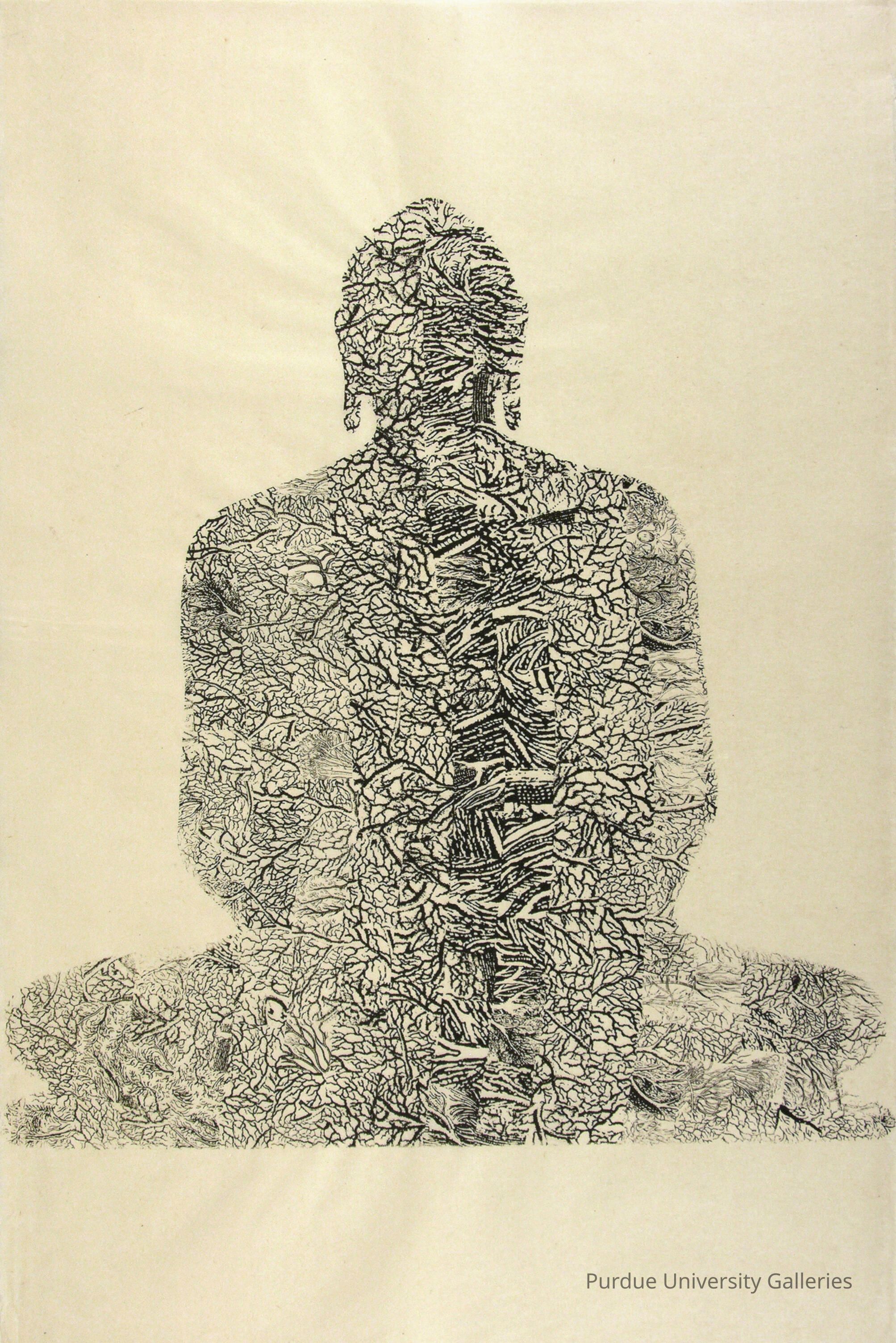 The meditating form of a presumably Hindu deity has been entirely composed of individual block prints, all containing veining, or tree roots and branching. It lends both an anatomical, under-the-skin feel to the form as well as a symbolic tie between figure and nature."