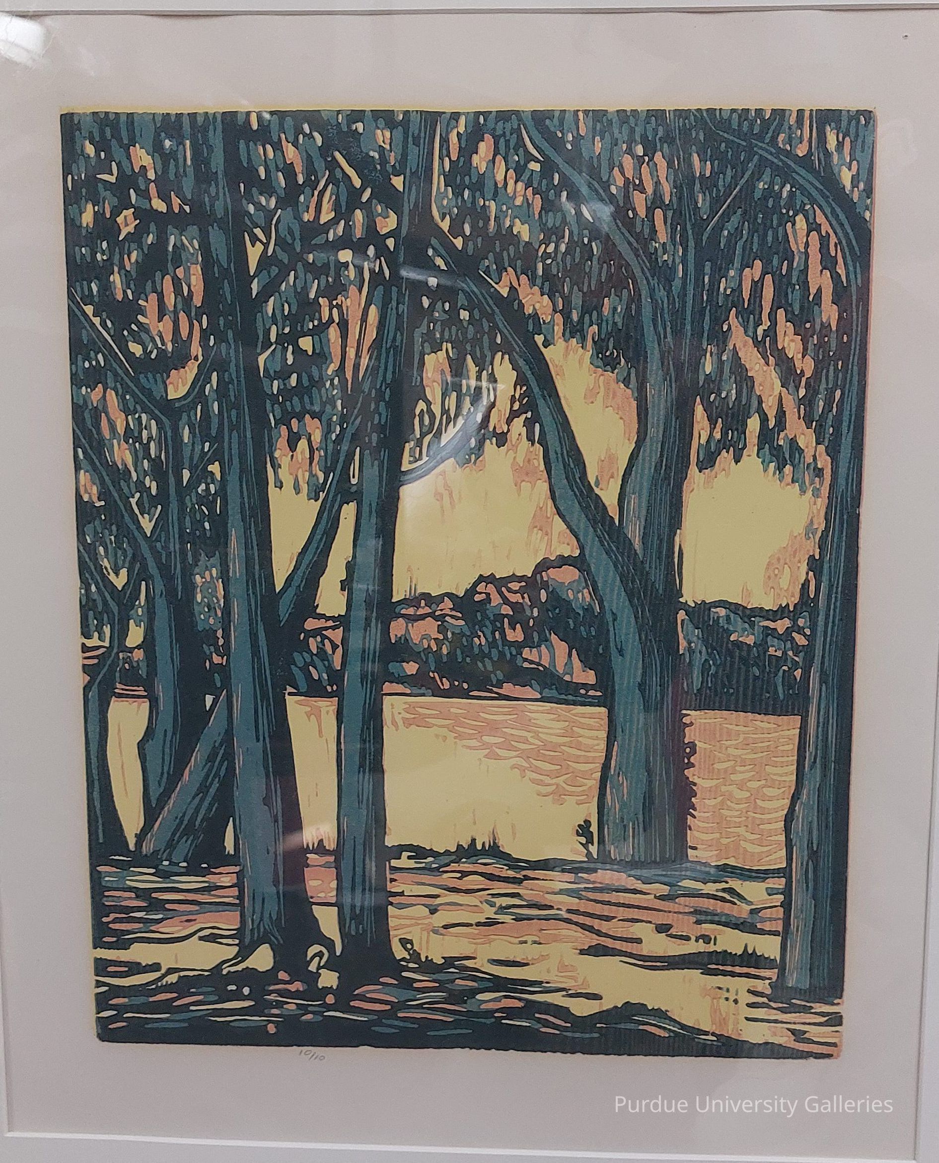 Woodblock print of trees near a body of water.