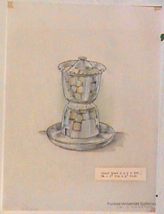 a design drawing for a candy bowl. the bowl is made into two parts with an attached tray at the bottom and a way to dispense candy from the bottomType of Drawing