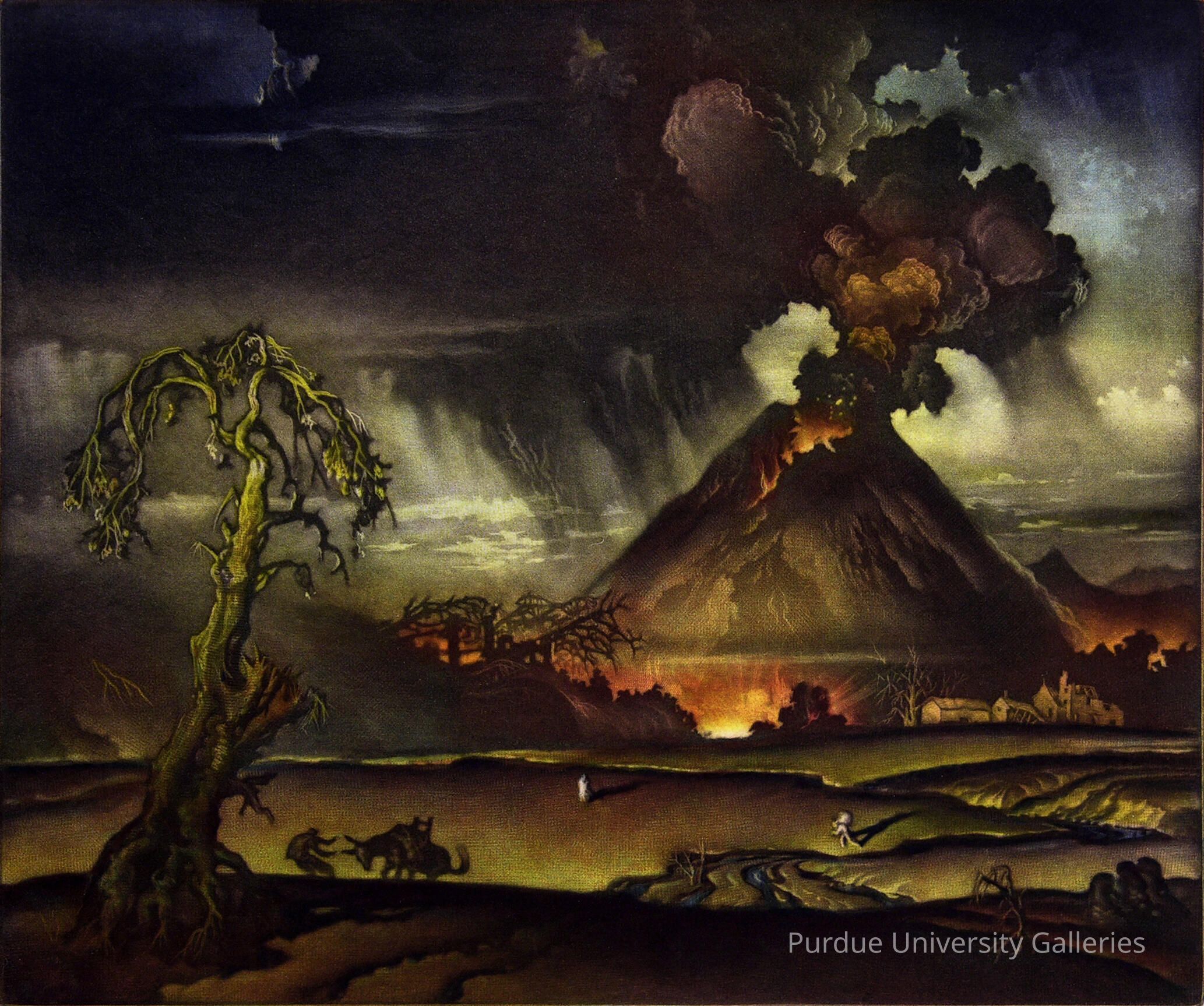 This print was the artist’s first attempt at a color mezzotint. As described in Riva Castleman’s Prints of the 20th Century, a mezzotint is “an intaglio print made from a metal plate, which has been manually scratched or pitted with a rocker (a multitoothed tool). The pits are subsequently smoothed away to form areas that will no longer hold ink.” In the scene, a volcano is erupting with billowing large clouds of black smoke which darken most of the sky. Behind the volcano a few other mountains appear, while directly in front and to the viewer’s left dead trees can be seen extending from a forest. On the right side of the print, in front of the volcano, appear three houses or perhaps a small village, which may be in the path of an oncoming lava flow. The middle ground is flat with streambeds cut through it. In the left foreground appears a prominent dead tree, dwarfing three tiny human figures; the three figures seem to have no connection to each other and are isolated. Of the two figures in the middle ground one appears to be carrying a pack on his back while another is seen further off. The third figure, closer to the foreground, seems to be struggling with a stubborn donkey or pack mule. The sky is filled with black and gray smoke, but one can still see a hint of bright blue behind. The ground and trees are a yellowish-green hue, and the lava glows with bright yellows, oranges, and reds. The overall mood is turbulent and violent. It reminds one of the Romantic notion of the sublime and the awesome power of nature over man.
