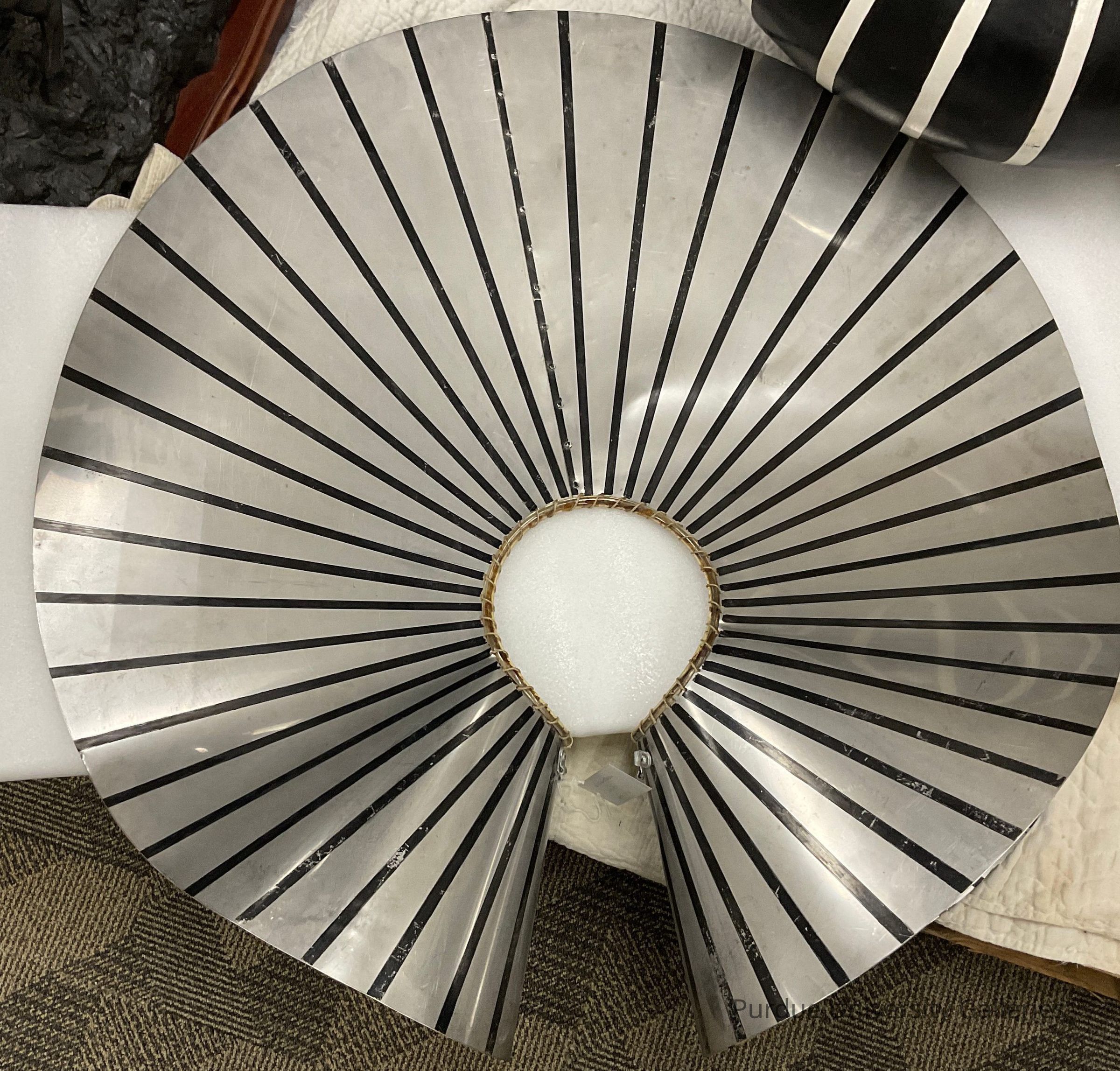 Round, metal fan-shaped back on itself to create a breastplate type covering. Black stripes are painted on surface and have minimal loss throughout.