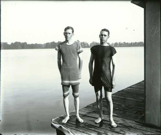 Two young men in bathing suits (shirts and swim trunks) at the edge of a wooden pier with the lake behind them.
