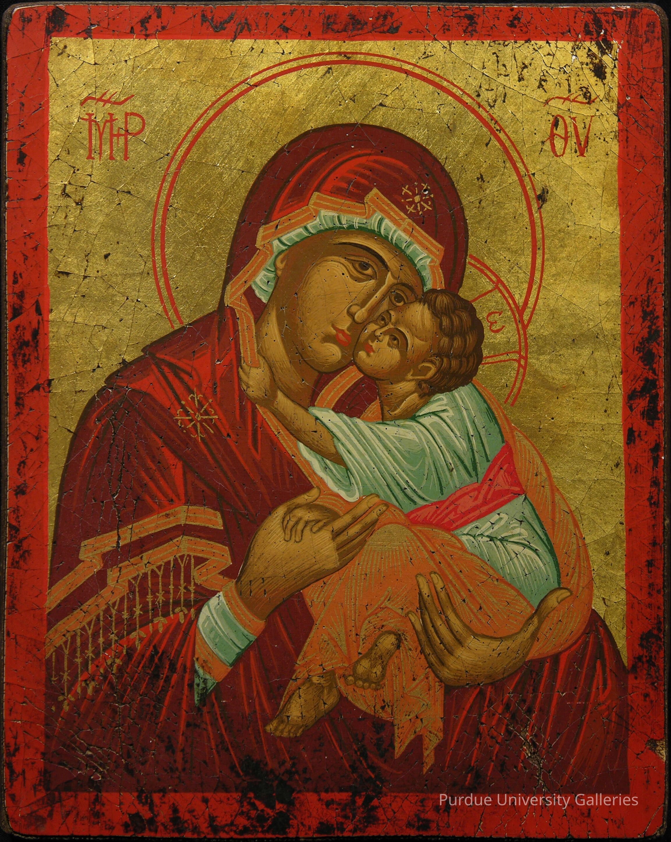 The linear treatment of forms, the round face of the Virgin with its slender, long nose, elegantly arching eyes, and small mouth, as well as the glowing gold ground, all reflect later Byzantine figure style. The emotional bond between mother and child is conveyed effectively.