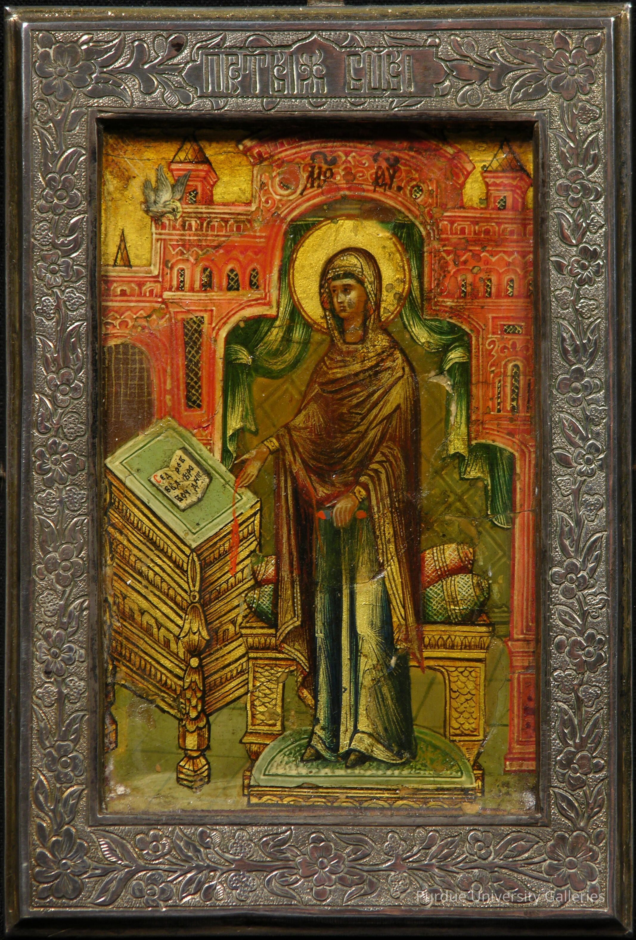 As in 2005.02.108 (representing the same theme), the Virgin stands in an interior setting, framed by an open doorway with curtains. As before, she has been reading a sacred text, opened on a lectern next to her. Here, however, the furnishings are very elaborate, including the gilded and carved lectern, a throne-like chair with cushions, and a partly rounded footstool. Moreover, the Virgin seems to greet Gabriel (who appeared in a separate panel) with one raised hand. In the background is a palatial building of reddish hue. The icon’s silver frame has a floral pattern. This work is closely related in style and scale to 2005.02.060, representing the Evangelist John, and both icons may be products of the same workshop.