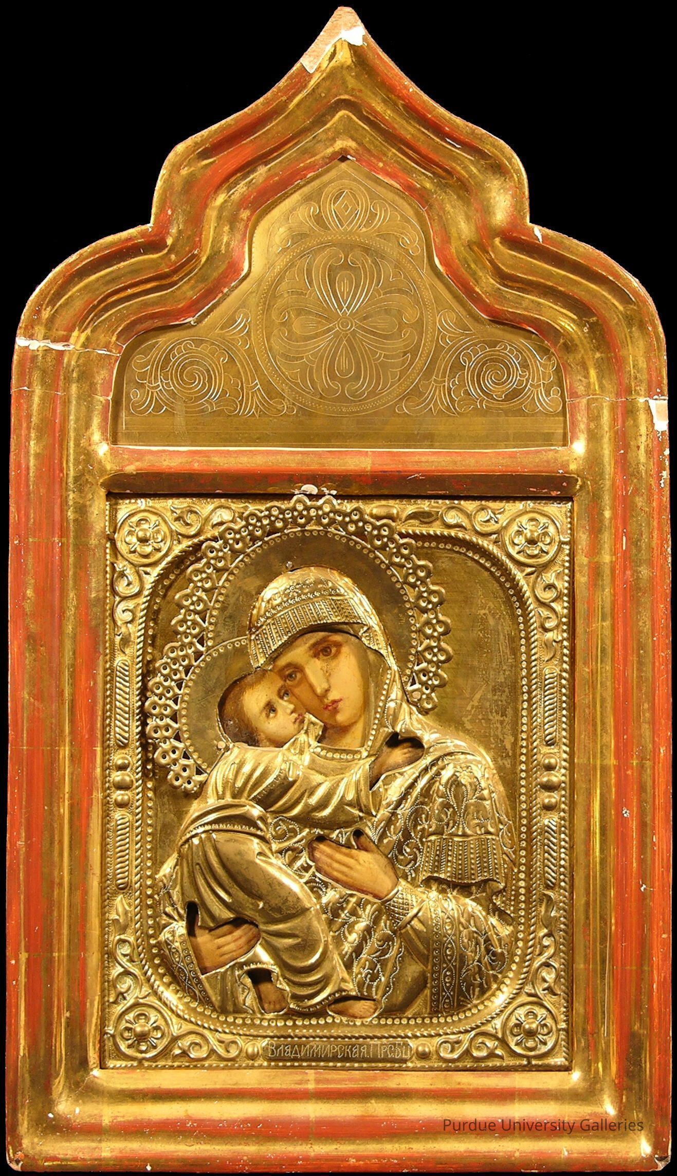 Partially painted wooden panel with cursive script on the back with brass riza, set within larger gilded wood frame (kiot). The kiot is painted red and decorated with golden paint and takes on an onion dome shape at the top. Beneath this is a gold plate with circular engraving designs. The riza is gold in color with encircled floral motifs in each of the four corners and a Cyrillic caption in the bottom center. The riza makes up the rounded decorative halos of Mother and Child, the plain robes of the Child, and the spiral designs on the Mother's robe and head veil. The painting itself shows the Virgin with brown eyes and her head tilted to the left to touch the cheek of her blue eyed son, holding him in her hands.Type of Painting
