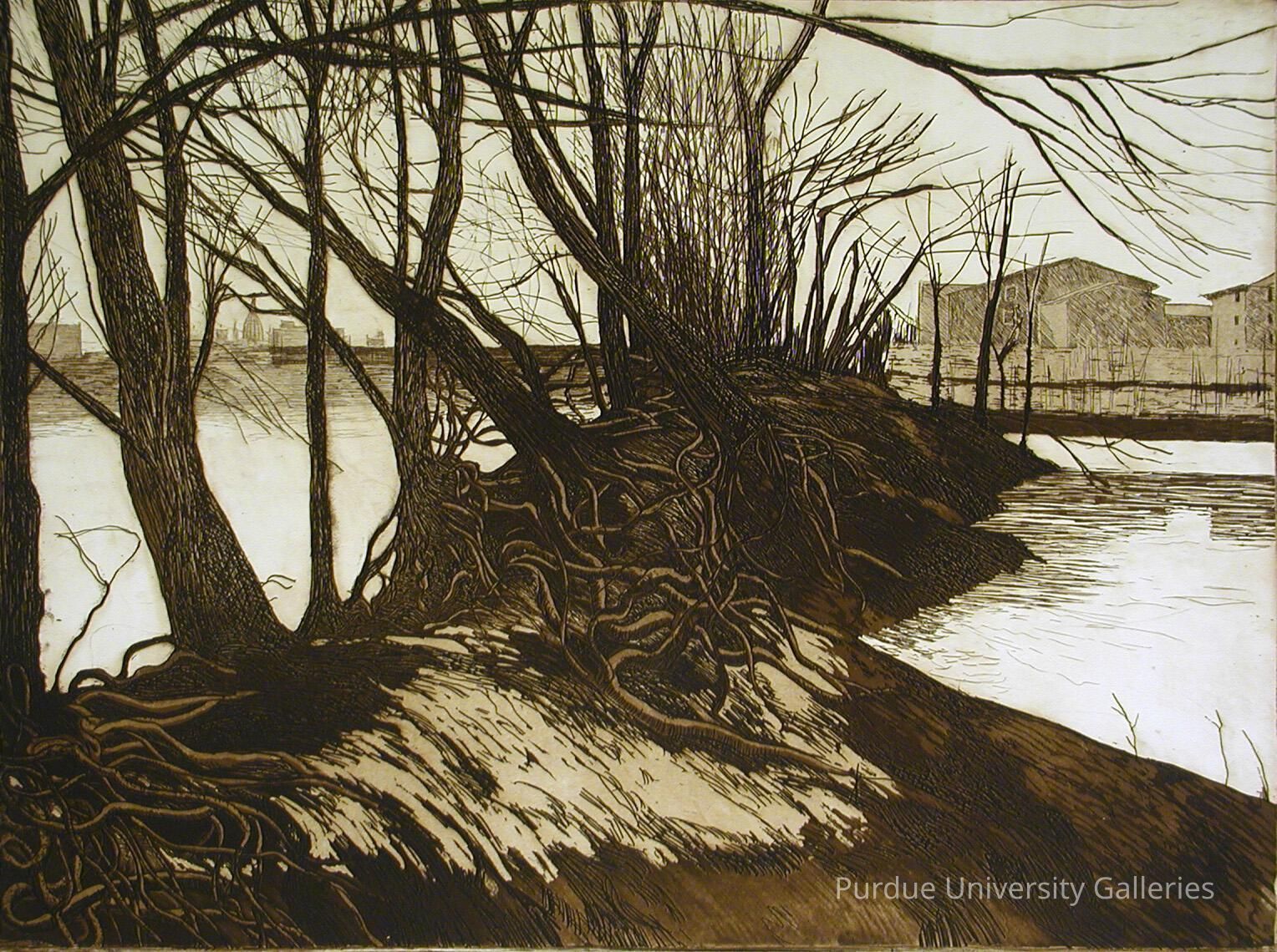 The Wabash River series contains eight prints: the first two images were done as woodcuts; three and four are lithographs; five through seven are etchings; and the last one also is a lithograph. The awards for this print include a prize in the 1978 Wabash Valley Exhibit, held in Terre Haute, and in1979 in the Westbrook, Kentucky Regional Show. The print’s viewpoint is located behind the Williamsburg Complex, in which the artist used an earth mound as a reference point. The print represents a tree-filled river bank with two areas of calm, serene water, and in the background appears a hazy sky with the silhouette of Lafayette. The buildings include the county courthouse with a cupola on top, surrounded by a few additional buildings that are boxy in shape, and on the right are a few other, house-like structures. The details are somewhat hazy. The focus of the image is the natural land in front, with its trees and their roots, where the ink is most concentrated and the lines of light and dark are contrasted most effectively. The roots almost seem like snakes trying to break free from their bonds to the trees. The quality of line also plays a key role, because the lines are solid and thicker here, in contrast to the thinner ones used for the rippling water. The artist’s style is realistic, but with an attractive element of abstraction in the sharply defined, variously textured lines in the foreground of the scene.