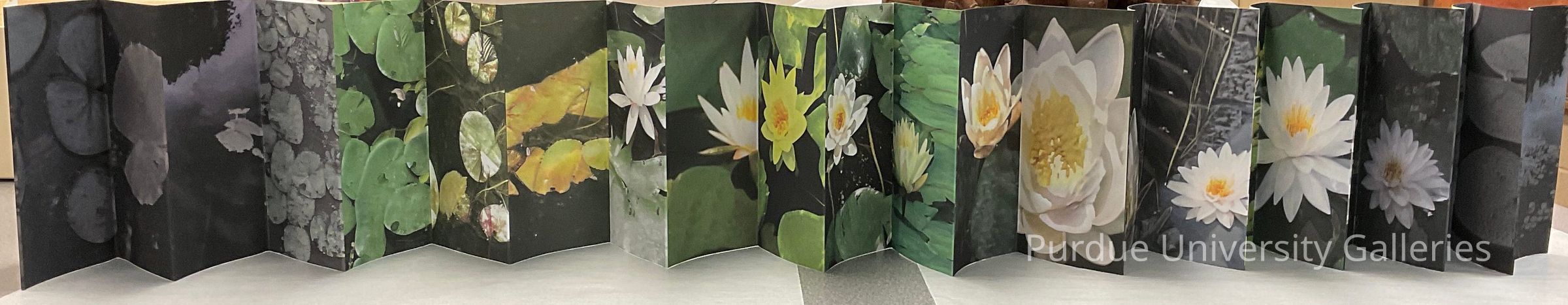 Four lengths of paper 6” H with 12 folds in it. Image is of 24 hour cycle of a water lily throughout the year. Both ends of the image are dark with the middle images being the brightest due to the noon day sun. Flowers are white and yellow. The first/last fold has a creased corner due to the packing of the piece.