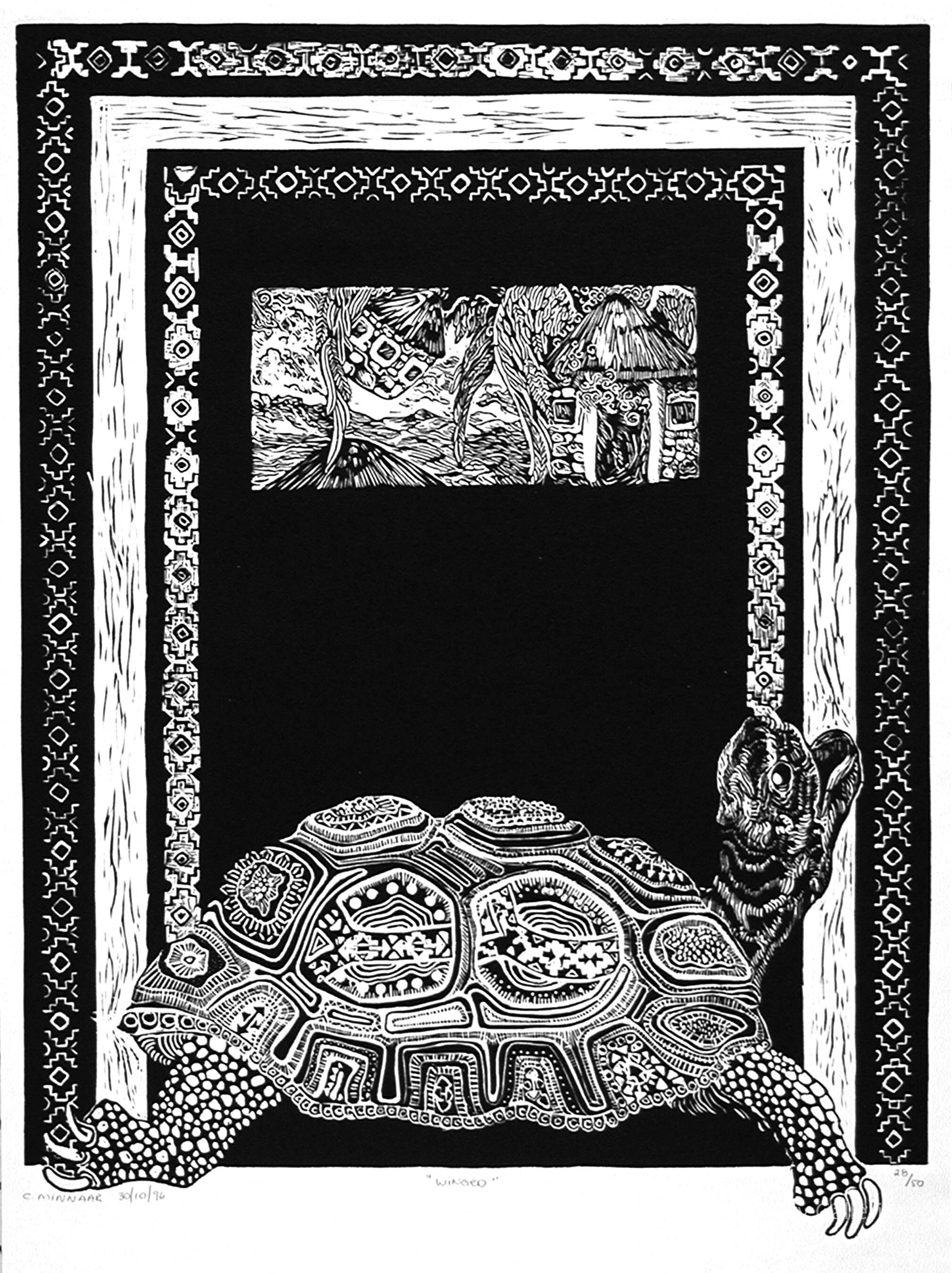 "(The Right to…) FREEDOM OF MOVEMENT & RESIDENCE Carina Minnaar Bloemfontein/Free State linocut “…the right to leave and enter the Republic, have a passport, and reside anywhere in the country.” " "